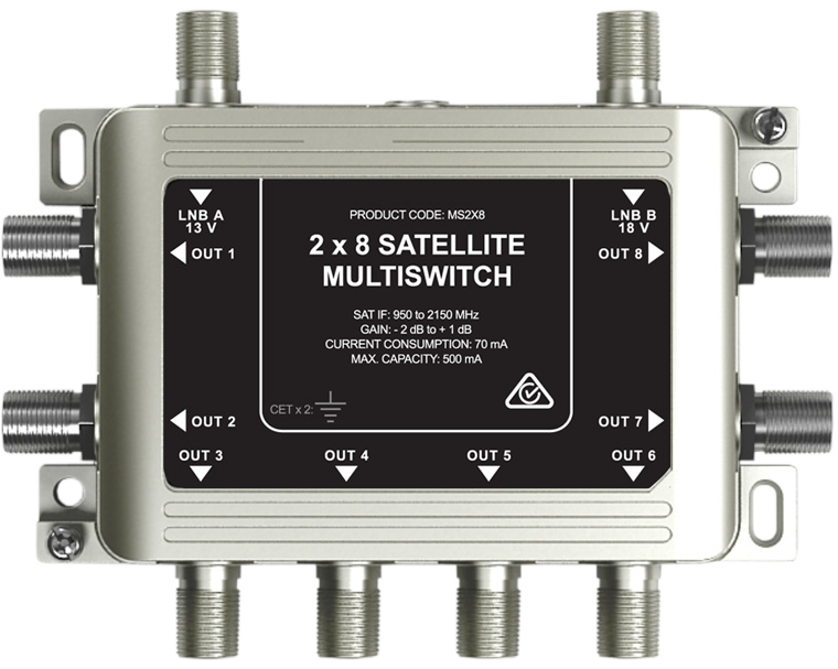Inputs 2 Outputs / Subscribers 8 Through Loss: SAT-IF: 950 ... 2150 MHz - 2 ... 1 dB Isolation: Input = 24 dB [Typ. 26 dB] Isolation: Switching = 24 dB [Typ. 26 dB] Current Consumption < 70 mA Capacity (IF Ports) Max 500 mA Ambient Temperature - 20 ... 50 C Dimensions (W x D x H mm) 118 x 72 x 19 mm
