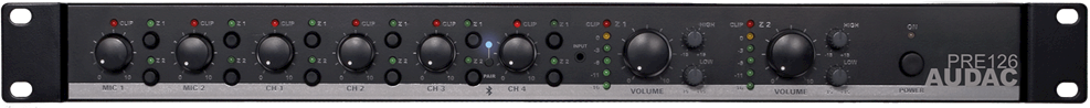 PRE126 is a two-zone 6 channel stereo preamplifier containing a variety of input possibilities for microphone and line level audio signals, offering a possibility for a wide range of small to medium sized audio