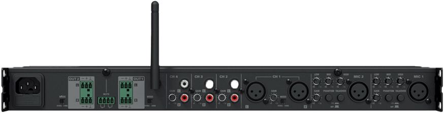 Additionally, an integrated Bluetooth receiver (mixed with Ch 3) and 3.5 mm jack connection on its front panel (mixed with Ch 4) are offering convenient wired or wireless connection possibilties for portable and handheld devices including laptops, smartphones and tablets.