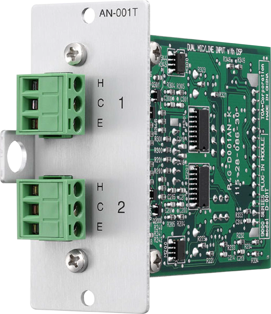 The AN-001T is a plug-in module of 2-channel ambient noise detector designed for use with the 9000 series amplifiers. It automatically adjusts the output volume in response to the change of ambient noise level. The AN-001T can handle input signals from microphone level (−60dB) to line level (−10dB) by controlling the gain in 9 steps. Phantom power (+24V) can be supplied for condenser microphone use.