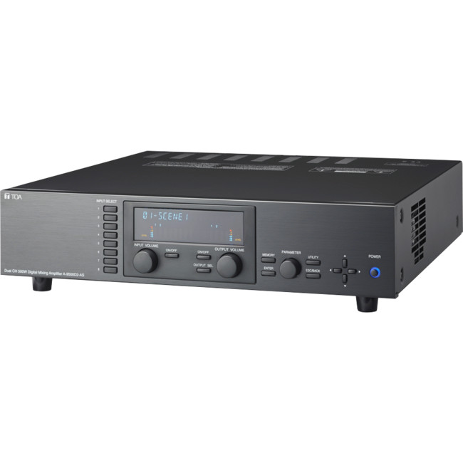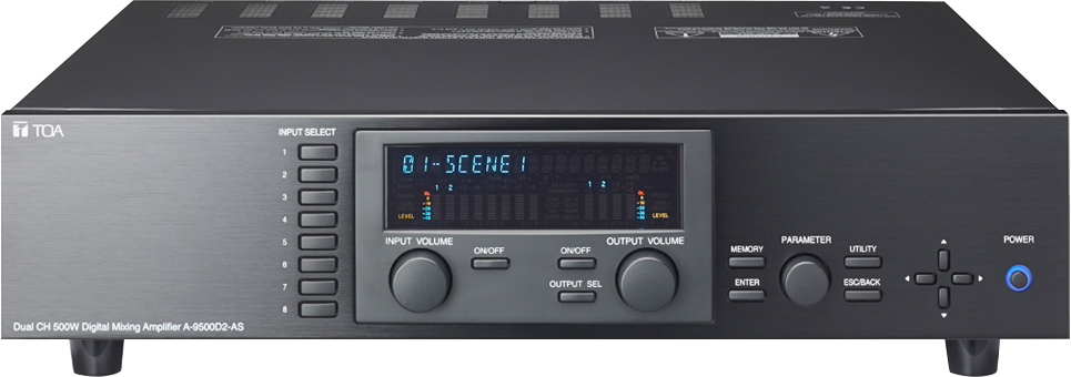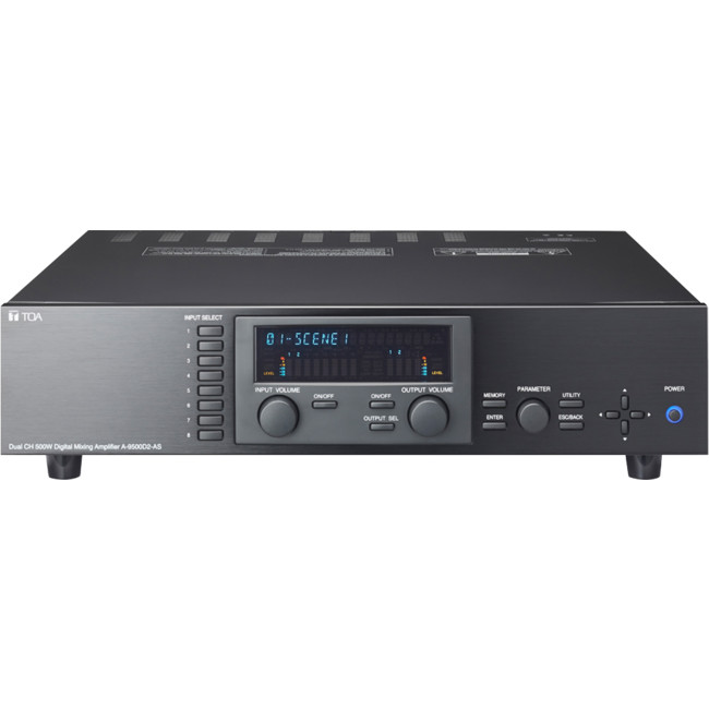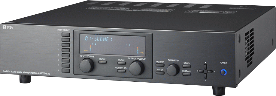 A-9500D2 is designed to be used in conjunction with optional modules and can be con gured for up to 8 inputs and 8 outputs. Usable modules include the following 9000 Series plug-in modules: D-001T and D-001R (2-channel input), T-001T (Audio output expansion), C-001T (Control I/O expansion), ZP-001T (Zone paging), AN-001T (Ambient noise sensor), and RC-001T (Remote controller inter face), as well as 900 Series input modules. The most appropriate modules can be selected depending on applications. It can be used as a mixer that is appropriate for speech or sound reinforcement applications, and equipped with signal processing and control functions, permitting all parameters to be set at the unit via VFD (vacuum uorescent display ) panel or on PC using the supplied dedicated sof tware.