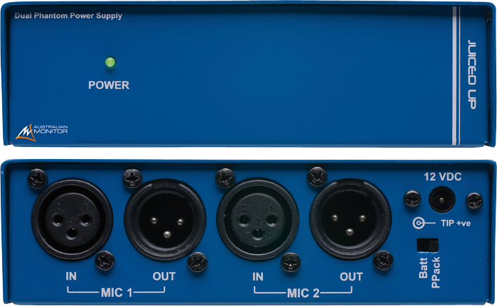 Australian Monitor contractor tool dual phantom power supply. Compact unit with XLR in/out connections. This Contractor tool can operate via the supplied external power supply or via two on-board 9 volt batteries, selectable via a rear panel slider switch and will supply 12VDC phantom power from battery power and 42VDC phantom power from an external power supply (included).