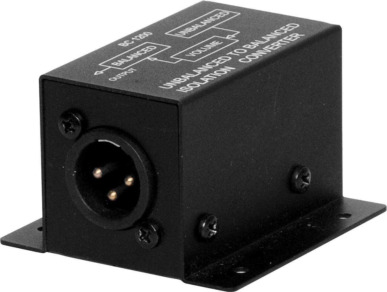 Unbalanced 10K Ohm 2 x RCA to balanced 600 Ohm 3 pin male XLR with level control. -10dB max signal gain.