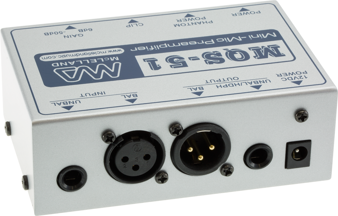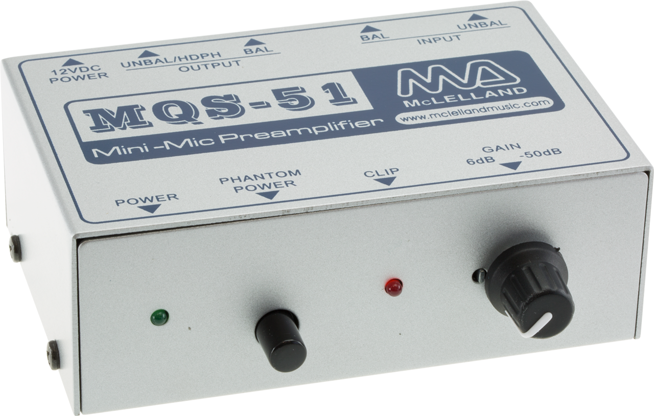 The MQS-51 is designed to provide a simple, compact and inexpensive microphone preamplification for a variety of applications. The unit has both XLR and 1/4" Inputs and Outputs, and a simgle Gain control with a Clip indicator. Phantom powering is included for the use with a condenser microphone. The 1/4" Output is specially designed for use aseither a mono balanced output, or a stereo headphone output.The unit comes with a power adaptor.