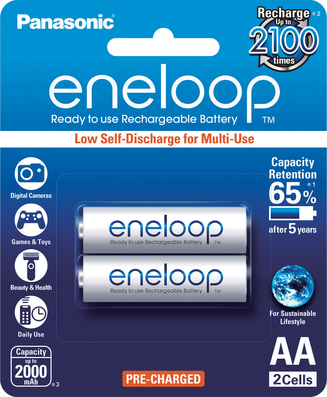 - 2 x AA Eneloop batteries Pre-charged and ready to use off the shelf