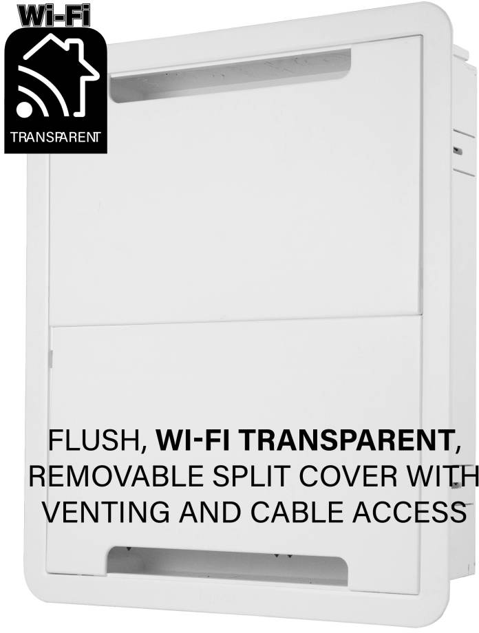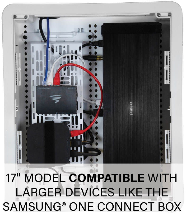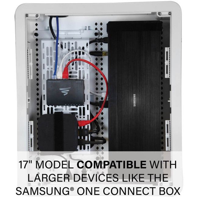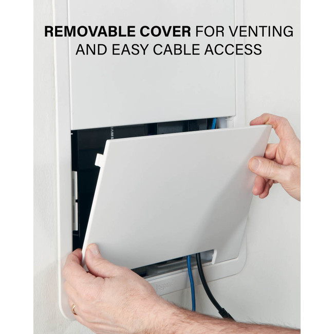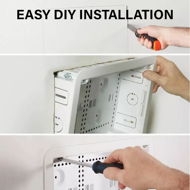The 17-in TV Media in-wall box is ideal for concealing and organizing media devices and power in wall to create a sleek, finished look. The perfect solution directly behind any wall mounted TV to store streaming devices like Apple TV, Roku, Amazon Fire TV, network switches and more. Constructed of Wi-Fi transparent material to manage wireless components with cable knockouts to help organize cables. Includes cover, trim ring and drywall clips, allowing for both new construction and retrofit installations.