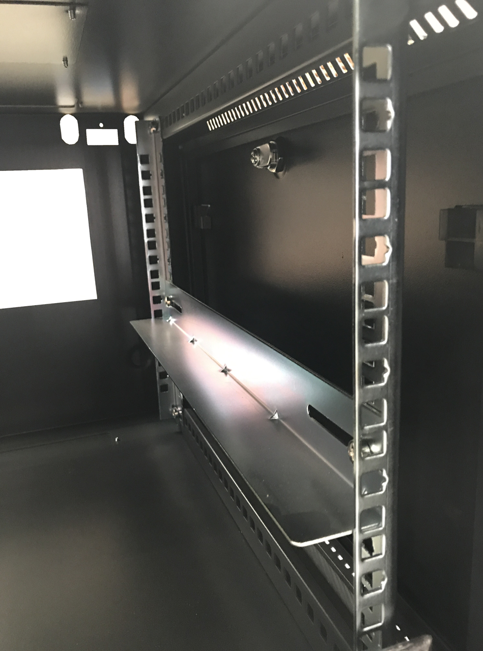 6RU x 600mm W x 600mm Deep Can be mounted on the wall. fitted under the desk. Tinted glass door. Removable sides, ideal to access to the back of the equipment.