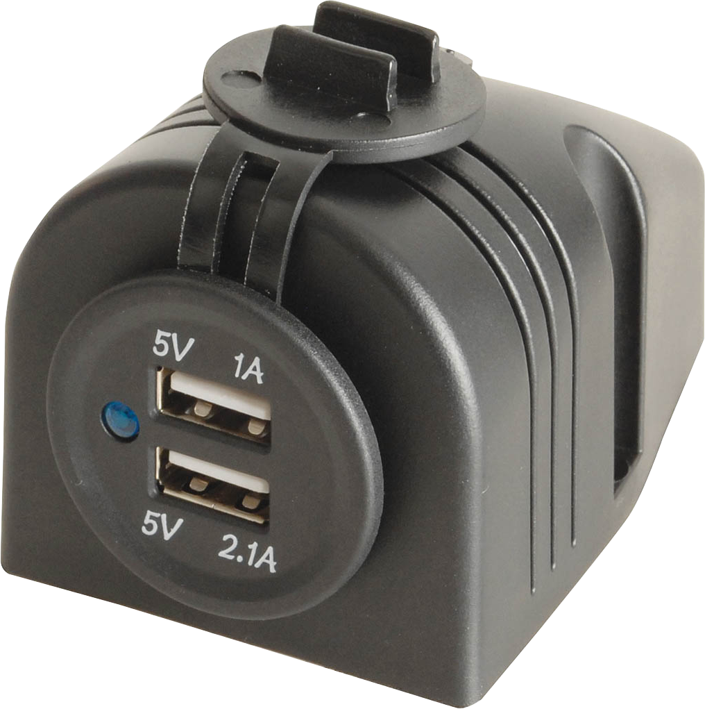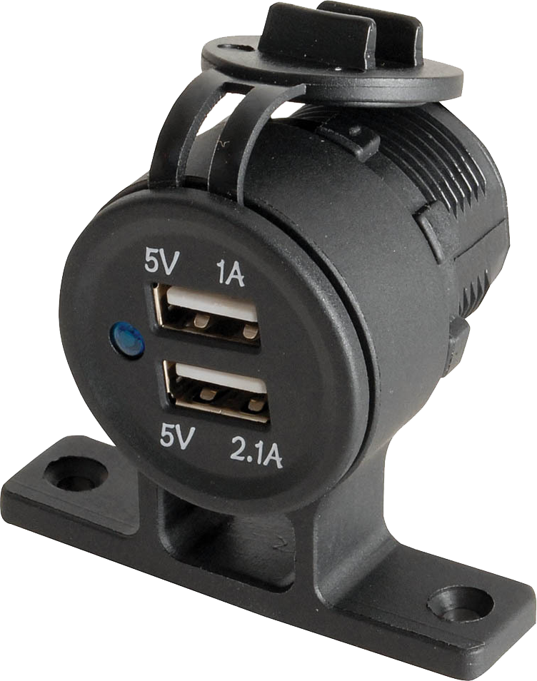 Get rid of your messy cigarette lighter car chargers, andfit something more permanent and better looking. This 2 portUSB charger has one port with 1.0A for charging a Smartphone, and the 2nd port can deliver 2.1A for fast charging your Tablet. Input power compatible with 12V and 24V battery systems, with connection via 6.3mm spade terminals. * Supplied with panel mount, under dash bracket, and a surface mount "hood" Dimensions: