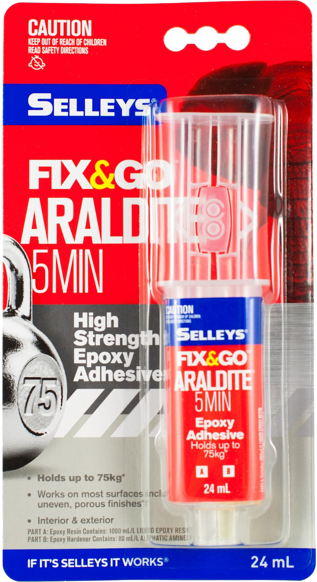Selleys Fix&Go Araldite 5 Minute epoxy adhesive is a clear, fast setting, two part epoxy which provides a rigid durable bond to a wide range of surfaces.