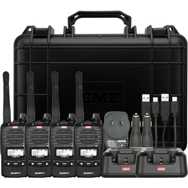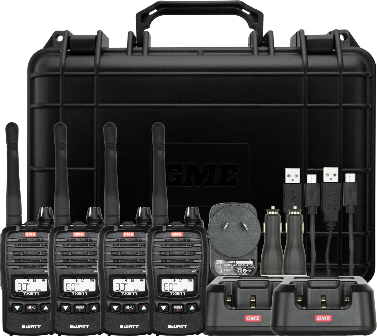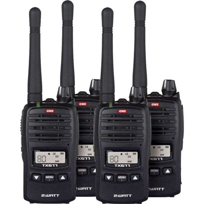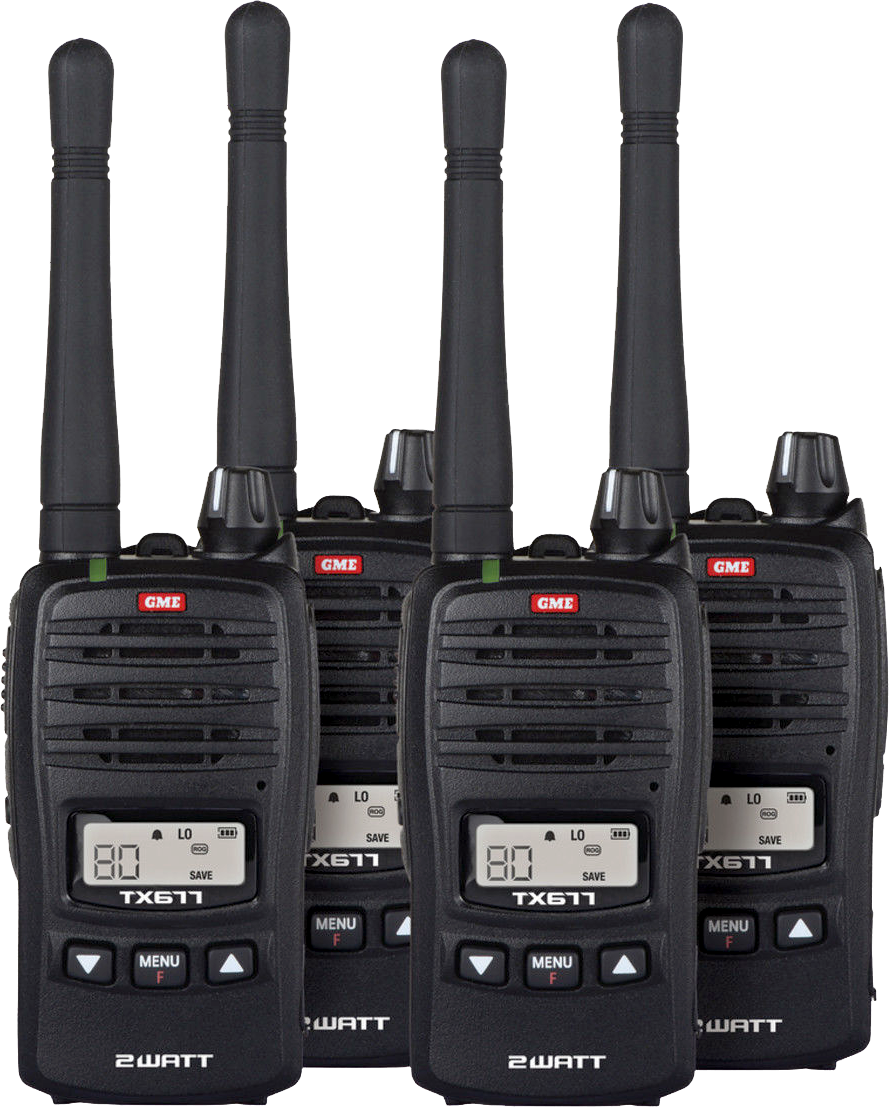 Introducing the all-new 2 Watt UHF CB Handheld Radio - Quad pack from GME, TX677QP. With a compact and lightweight mechanical design, up to 14hours battery life, convenient USB charging, a rotary power/volume control for easy operation, switchable transmission power (2/ 0.5 watt), and a user programmable scan function, the TX677 is a serious performer in a compact chassis. The TX677QP includes four TX677 radios, two convenient twin desktop chargers, two 12V DC vehicle chargers, an AC adaptor, and a rugged heavy-duty carry case.