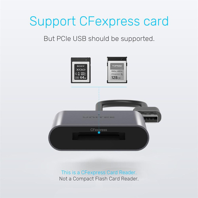 USB C and USB A to CFexpress Card Reader, support CFexpress B memory card data transfer. Read and write high-resolution photos, full HD videos from your CFexpress card quickly, and transfer speed. Equipped with USB-A and USB-C cable to allow one device to compatible with a varietyof MacBook Pro, mac air, computer, laptop, Notebook, and other type-c &type-a devices, the USB C Cable also support thunderbolt 3 port connection.
