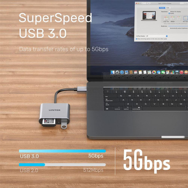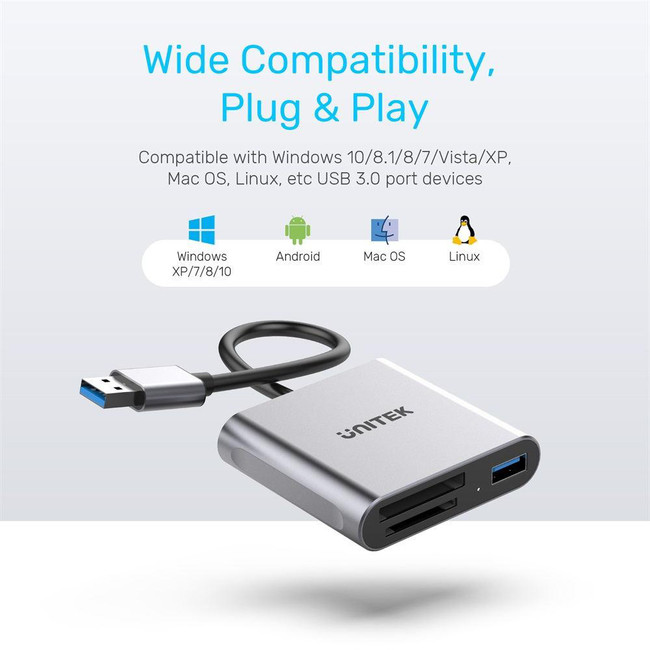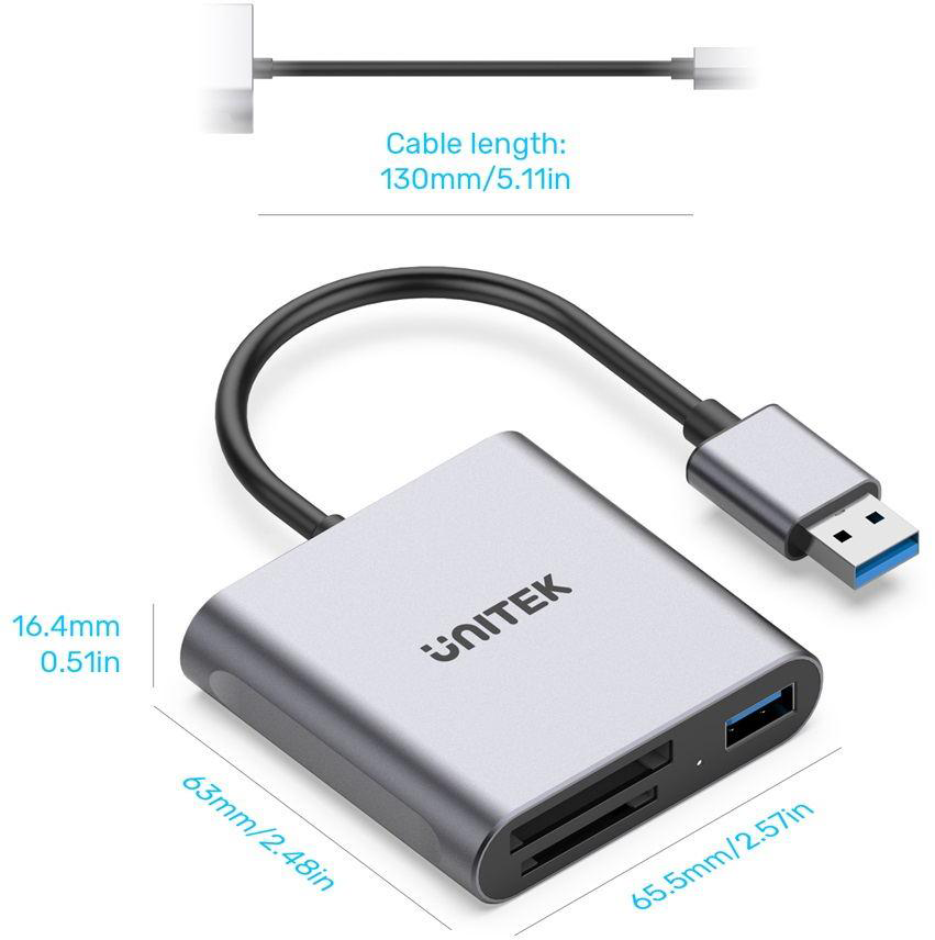 Unitek USB 3.2 Gen1x1 XQD/SD/TF memory card reader adapter with USB3.0x2 fast speed up to 5Gbps, compatible with Sony G&M Series XQD and TF/SD/SDHC Cards, for Windows, Mac, Linux.