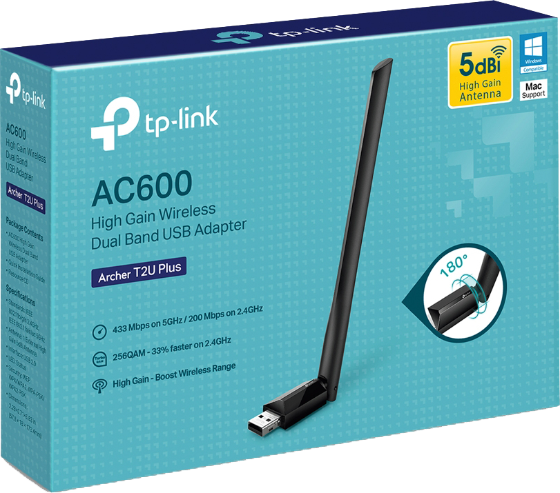 Archer T2U Plus has one 5dBi high-gain external antenna to ensure stronger signal transmission and reception. Enjoy a stable Wi-Fi connection throughout your home.