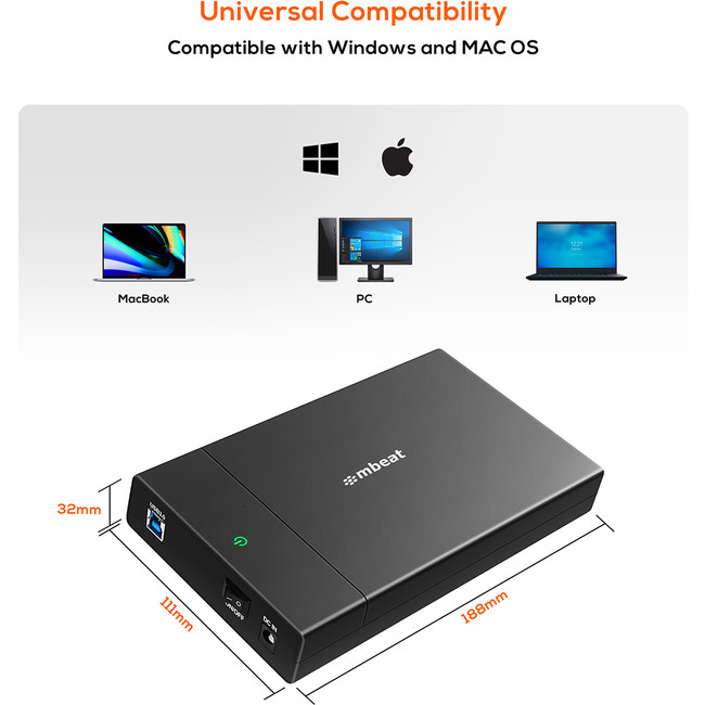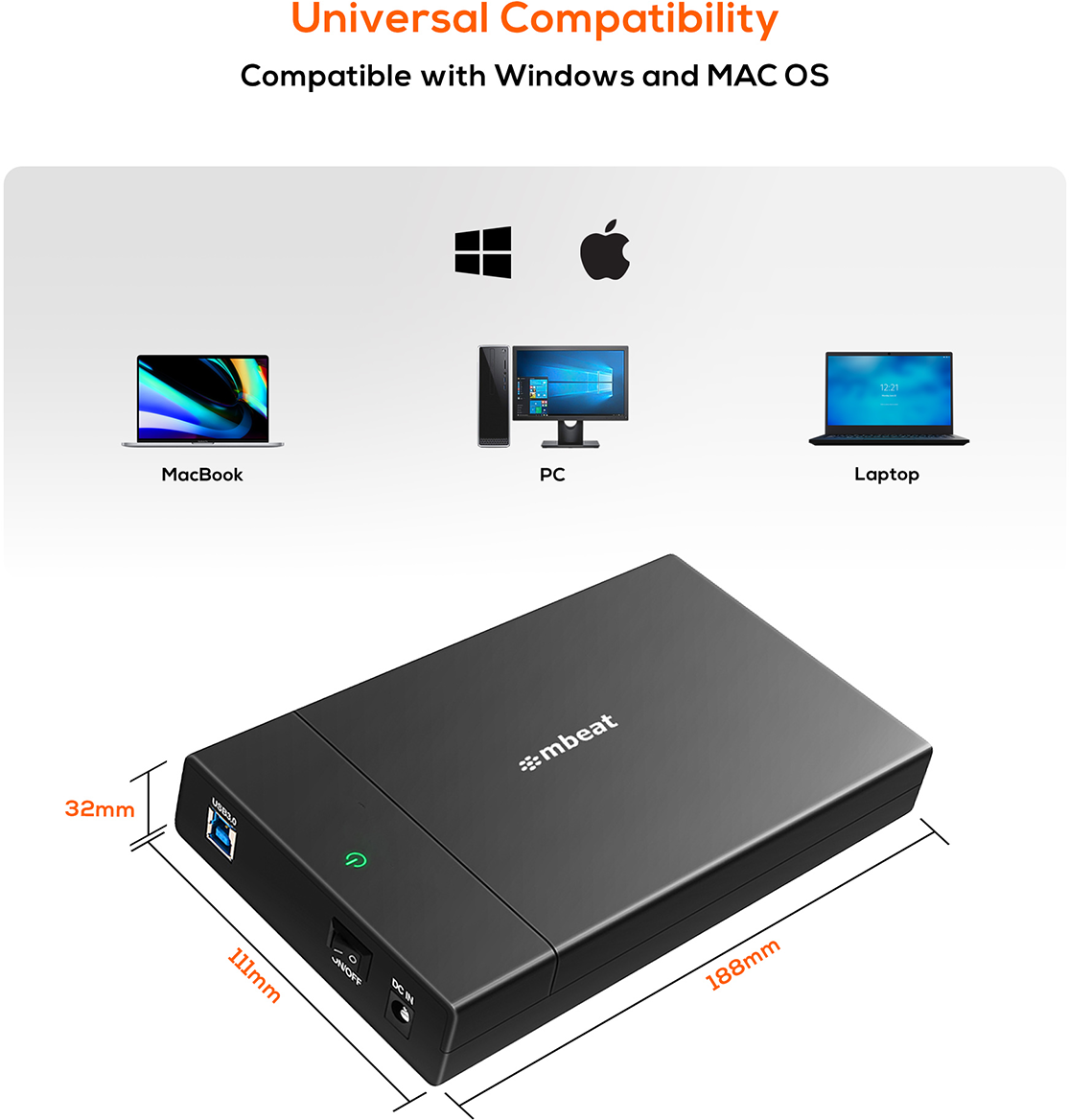 • Universal Compatibility: Accommodates 3.5″ and 2.5″ SATA HDDs/SSDs up to 20TB, compatible with Windows and MAC OS.