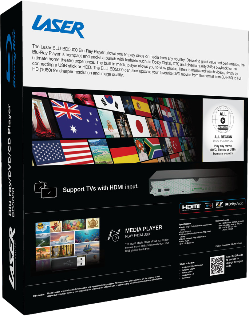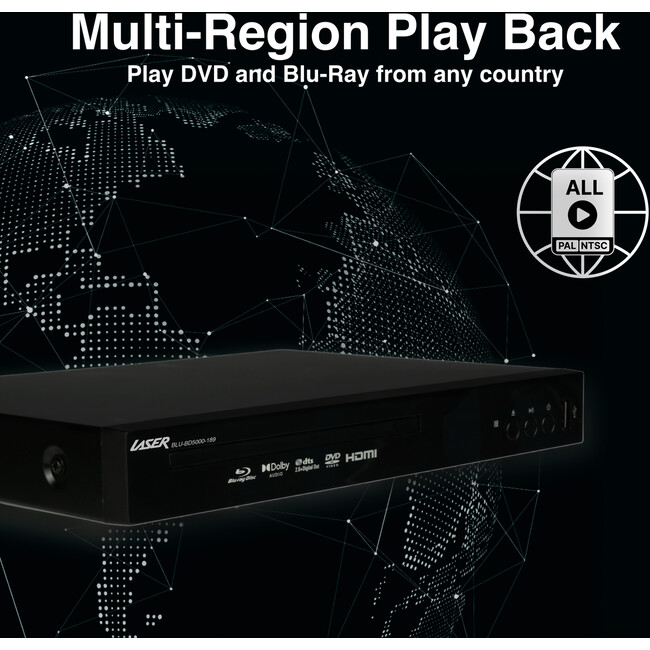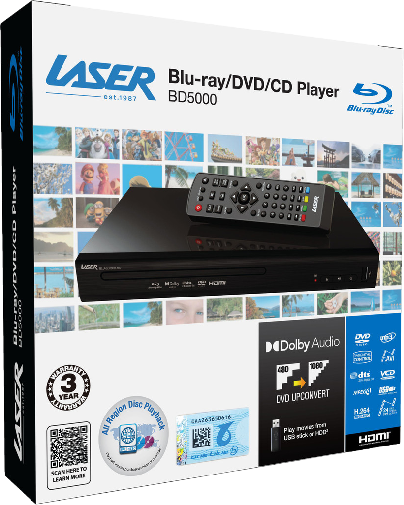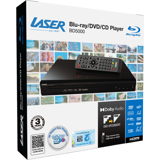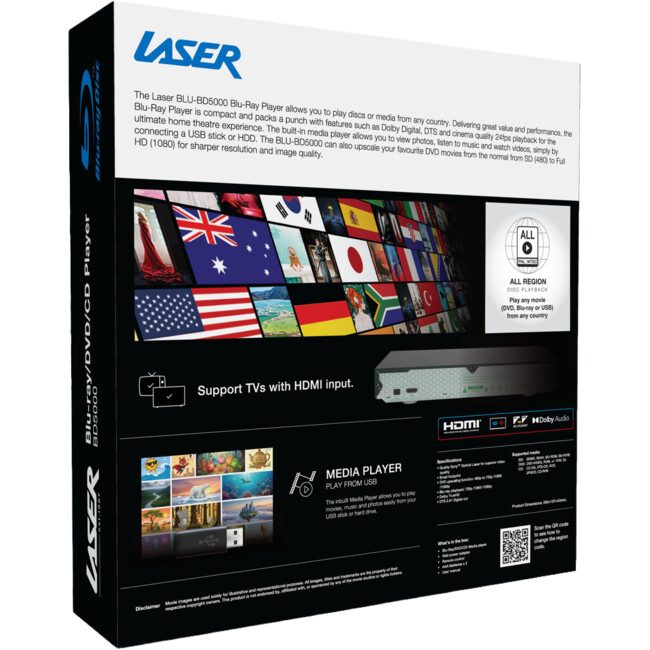 The Laser BD5000 delivers stunning Full HD 1080p video and immersive Dolby Digital / DTS 7.1 surround sound — bringing true cinematic performance home. With full multi-region playback across all 8 DVD and 3 Blu-ray regions, it opens your lounge room to a world of movies, music and memories — no borders, no limits.