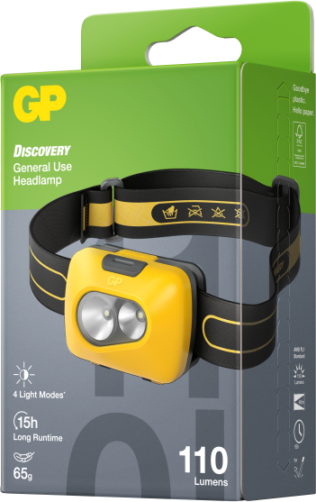 Discover life’s possibilities like never before with GP DISCOVERY General Use Headlamp CH42. Built to make life easier for everyday applications. With a beam distance of 40 metres and up to 110 lumens, it is ideally suited for all around-the-house lighting demands. Illuminate your way by choosing from 3 brightness levels and flashing mode. Features an easy-to-use single button for simple operation and easy navigation of all essential lighting features. Made to take on every task assigned thanks to splash-proof water resistance, 1-metre shock proof exterior and a machine-washable and adjustable headband