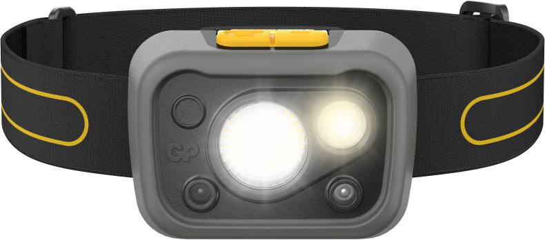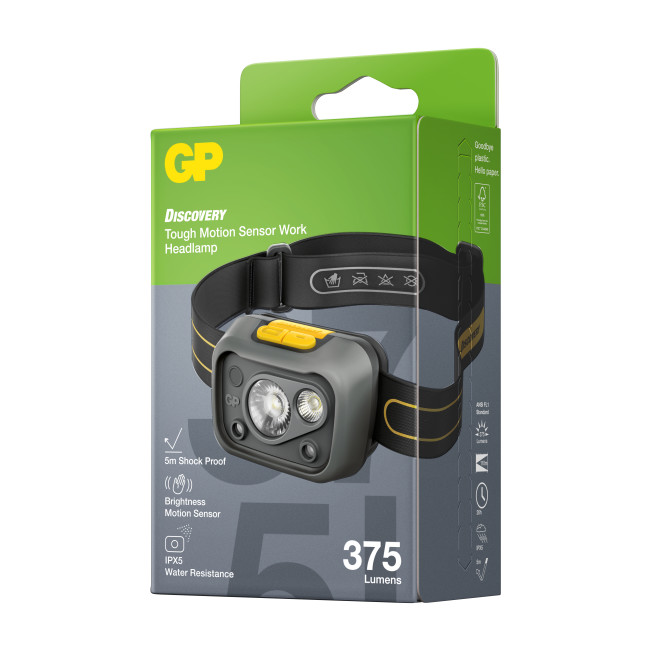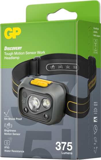 Get into every task, every project, and every detail in the dark without the distraction oflosing the light you need to get things done. GP DISCOVERY Tough Motion Sensor Work Headlamp CHW54 is made to deliver reliable illumination for your work and DIY project.With up to 375 lumens and 4 different lightmodes, it offers exceptional brilliance for wideand far areas of up to 110 metres. Rugged and resilient, this headlamp features IPX5water resistance and can with stand drops from up to 5 metres. Designed for maximum convenience, this sturdy headlamp can be operated hands-free with a motion sensor.