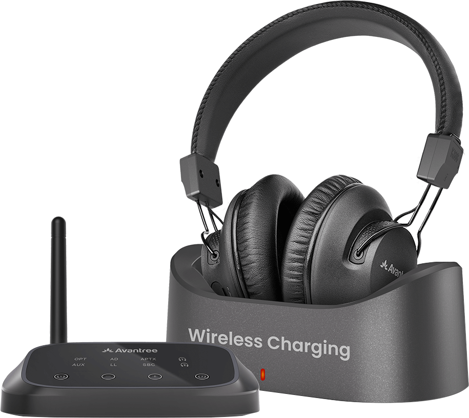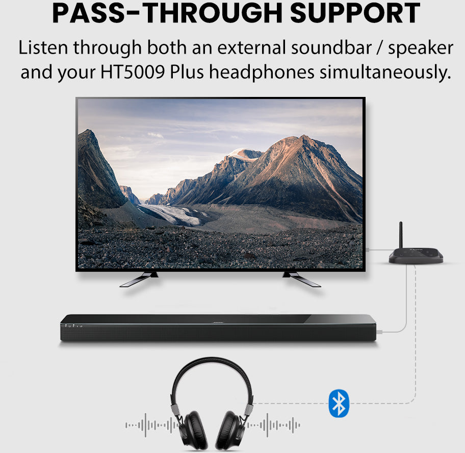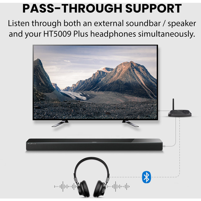 The HT5009 Plus is a set of headphones, a transmitter, and a charging dock specifically designed for TV watching. Both the headphones & transmitter utilize advanced Qualcomm chipsets that minimize audio delay, resulting in a perfectly synced audio & visual experience.