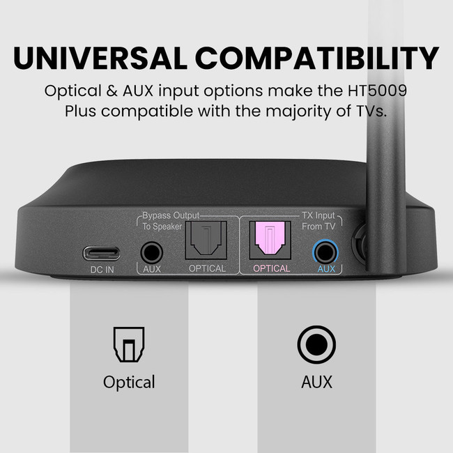 With optical & AUX input options, the HT5009 Plus transmitter is compatible with most TVs on the market.