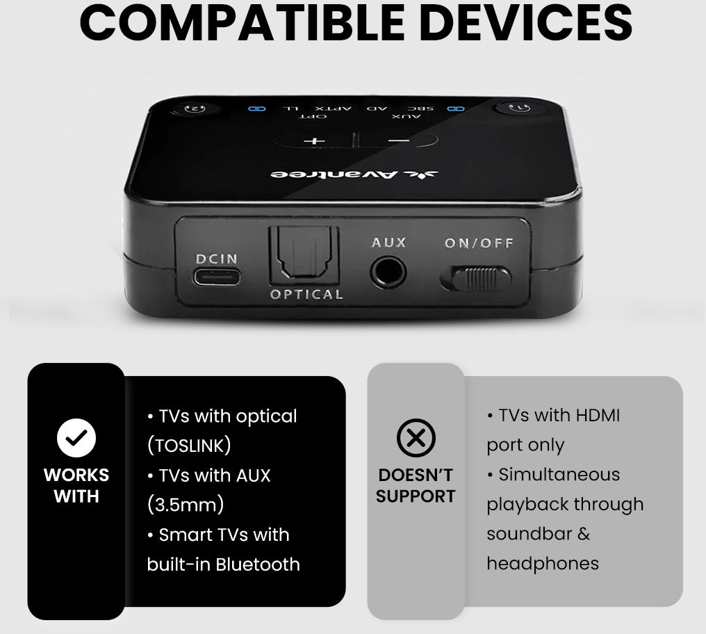 The Avantree HT41899 Plus supports TVs with optical (TOSLINK), AUX (3.5mm), or built-in Bluetooth audio outputs. Before purchasing, confirm that your TV has one of these options. With the HT41899 Plus, you'll be able to listen to your favorite TV shows & movies at your own volume without disturbing those around you.