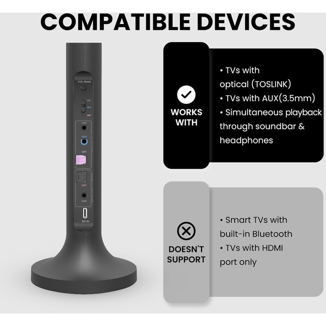 The “Bypass” or “Pass-through” feature of Avantree Duet allows the two headphones transmitter set to work TOGETHER with your existing soundbaror stereo AV receiver AT THE SAME TIME. This is perfect for group settings – The headphone user will be able to listen to the TV at his/her own volume while the others can hear directly through the sound bar & speaker system.