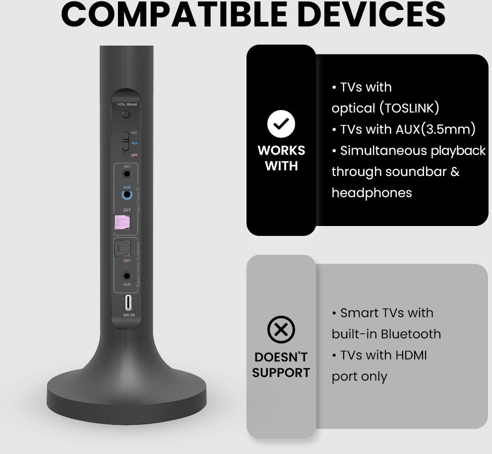 Enjoy TV in quietness, with a partner - The Duet set comes with two pairs of wireless headphones, each already factory pre-connected to the transmitter base, so there’s no need for you to go through the complex & painful manual pairing process. Simply connect the transmitter base to TV, power everything on, they’ll connect with each other automatically and you’ll be good to go!