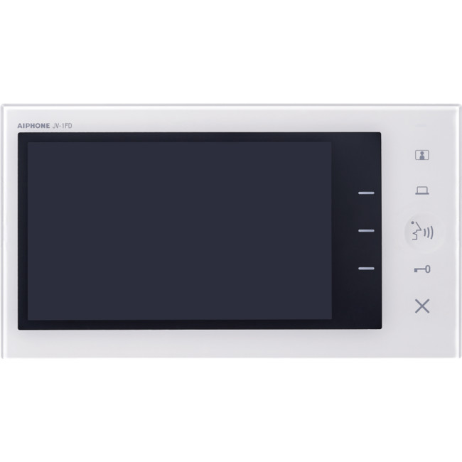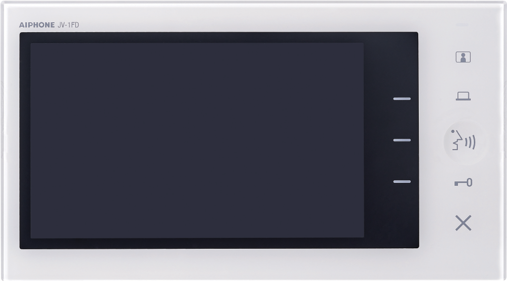 The JV-1FD is an expansion station for the JV Series. The station provides an extra monitor for JV Series systems. One can be added per JV system. The station features a 7″ screen to view visitors and configure settings. The electrostatic touch buttons to the right of the screen allow users to unlock the door and activate an exterior device.