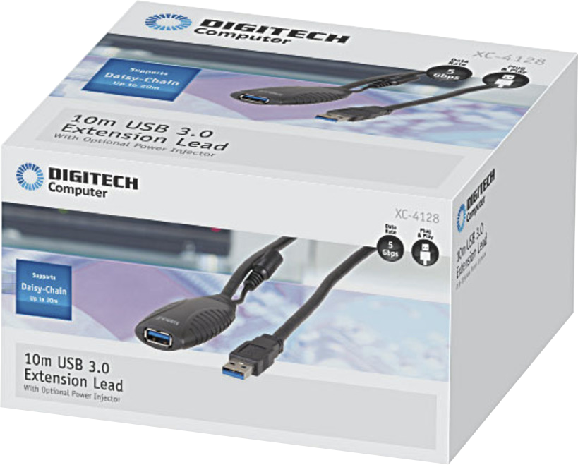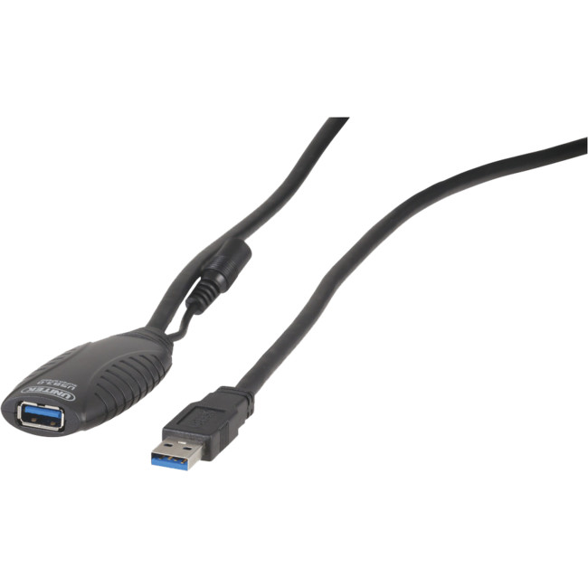 USB leads are notorious for reducing data speeds over long distances, which is why you often struggle to buy a USBcable over the standard 1.8m length. This specialist USB extension lead features electronics to allow transmission over 10m, and even up to 20m if you daisy-chain two of them together. No loss in data, no connectivity dropouts, or any of the problems that usually plague "doubled-up" leads. Full USB3.0 compliance up to 5Gbps, and backward compatible too. Cable includes a DC power socket on the output terminal which can be connected to a 5V power supply for devices which require more power.