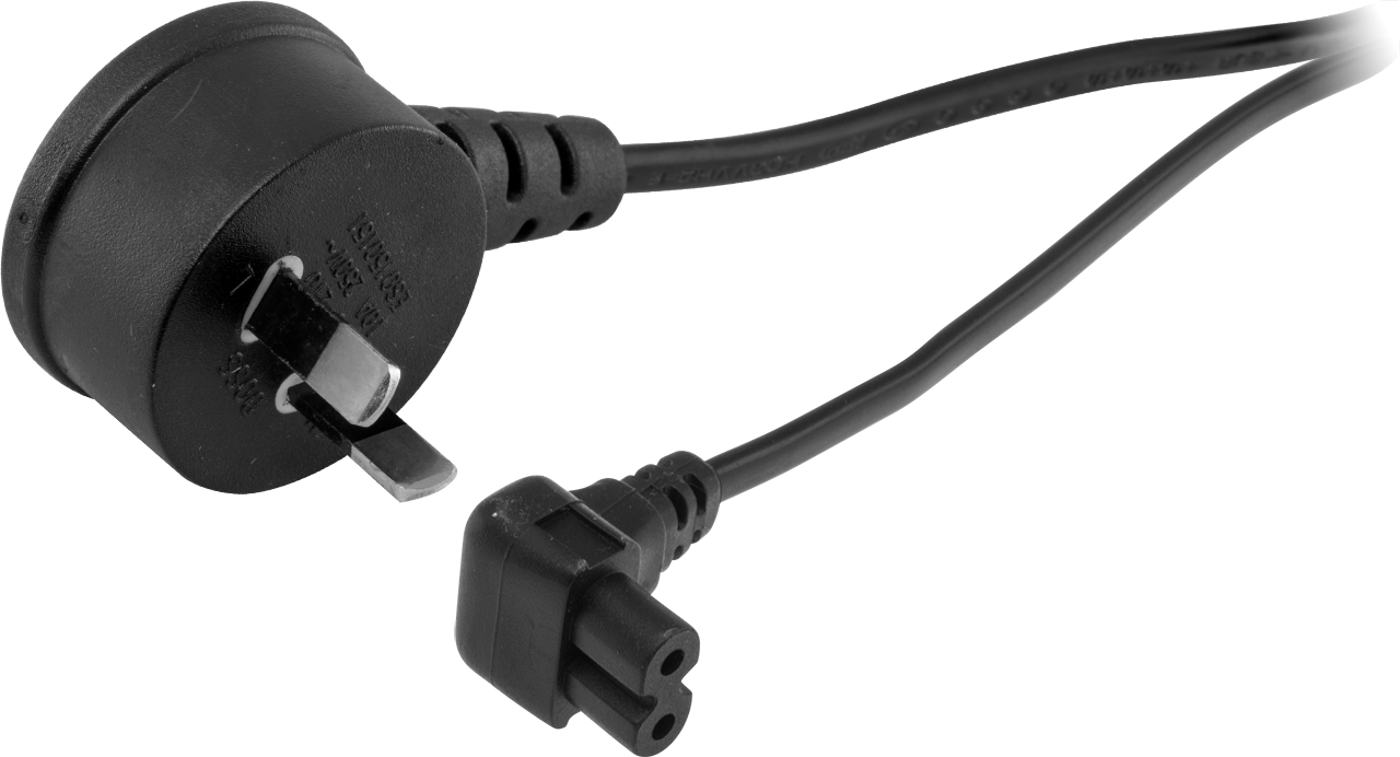 • Fitted with a Right-angle IEC C7 / Figure 8 connector and Right-angle Australian 2-pin mains plug with insulated pins compliant with AS/NZS3112.