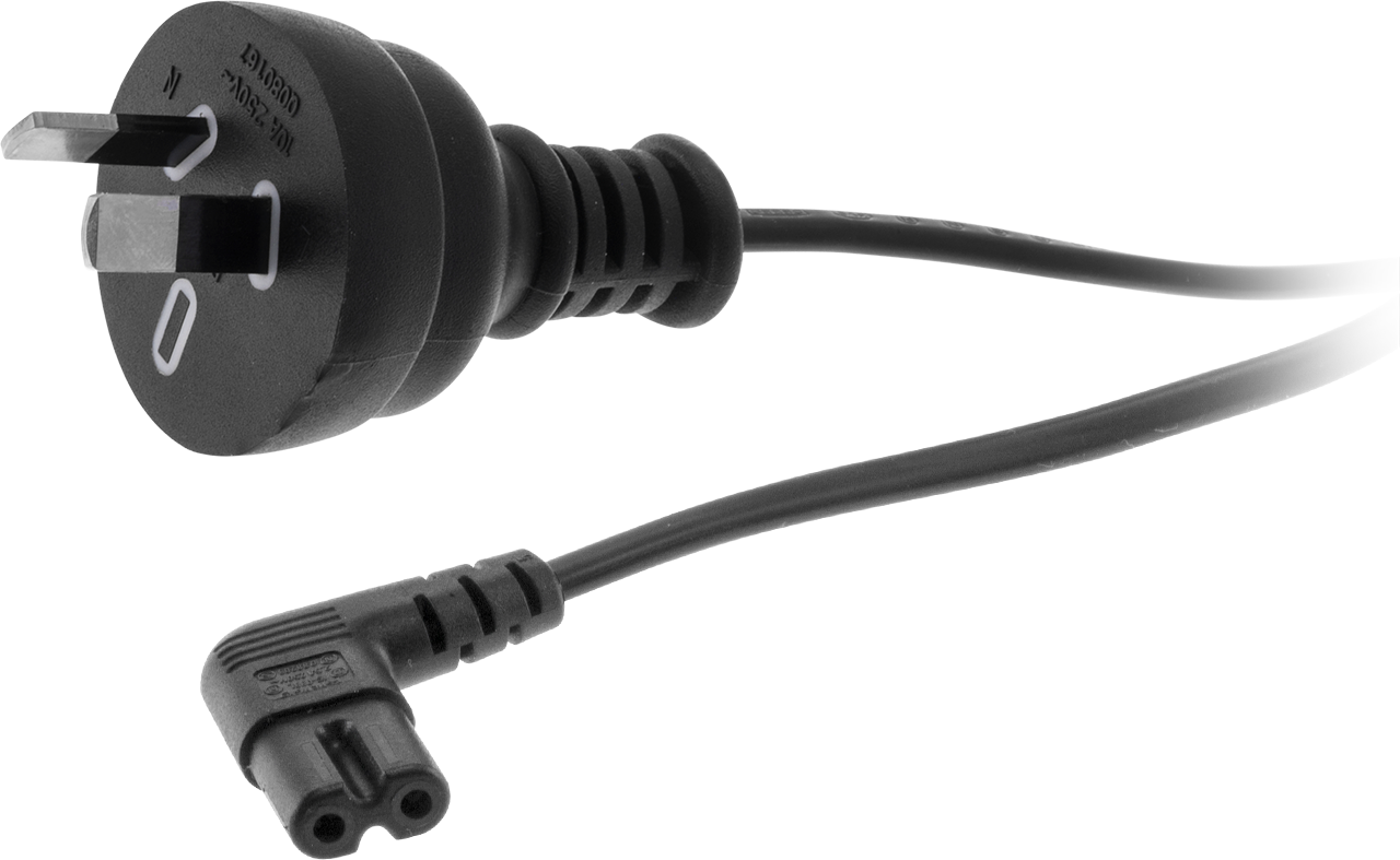 • Fitted with a Right-angle IEC C7 / Figure 8 connector and Straight Australian 2-pin mains plug with insulated pins compliant with AS/NZS3112.