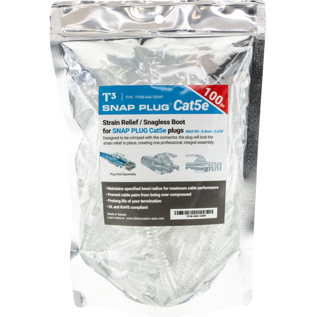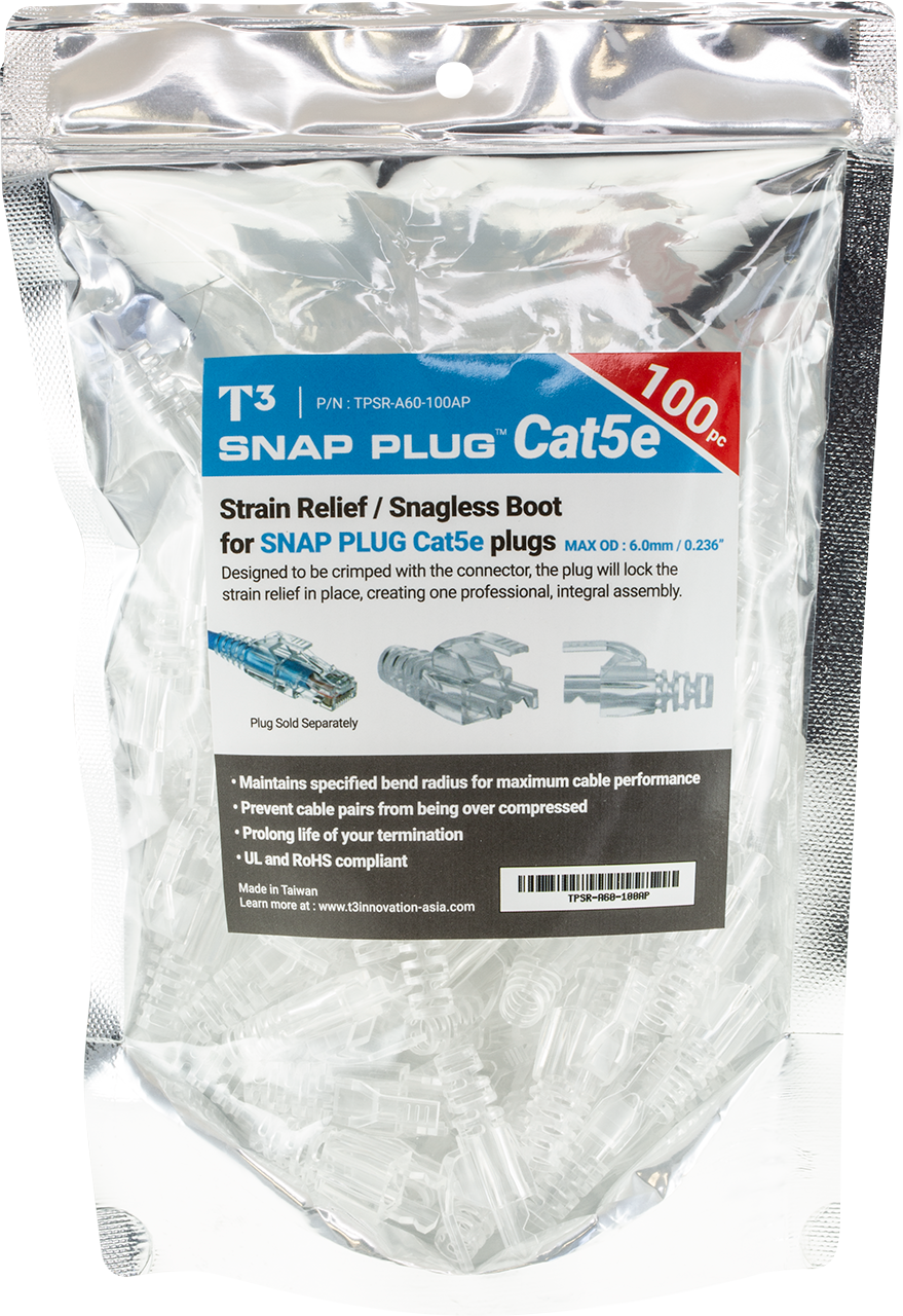 This strain relief and snaggles boot is designed to be crimped with the Snap Plug CAT5e connector, the plug will lock the strain relief in place, creating one professional, integral assembly.