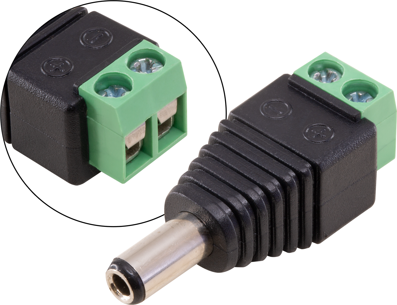 2.1mm DC Plug to screw terminals. Terminals made from non-recycled materials for longer life