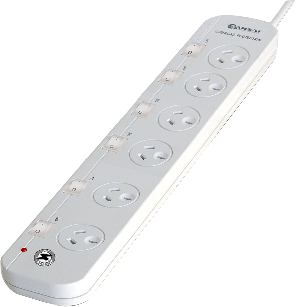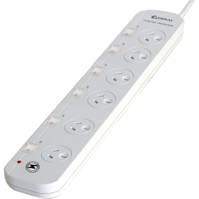 6 power outlets Master On/Off switch Surge and overload protected 1 metre lead & Right angle power plug 4 ports USB charger