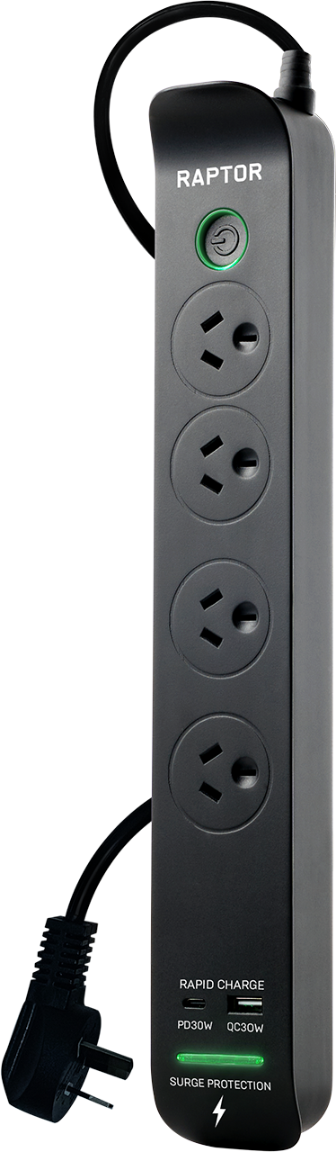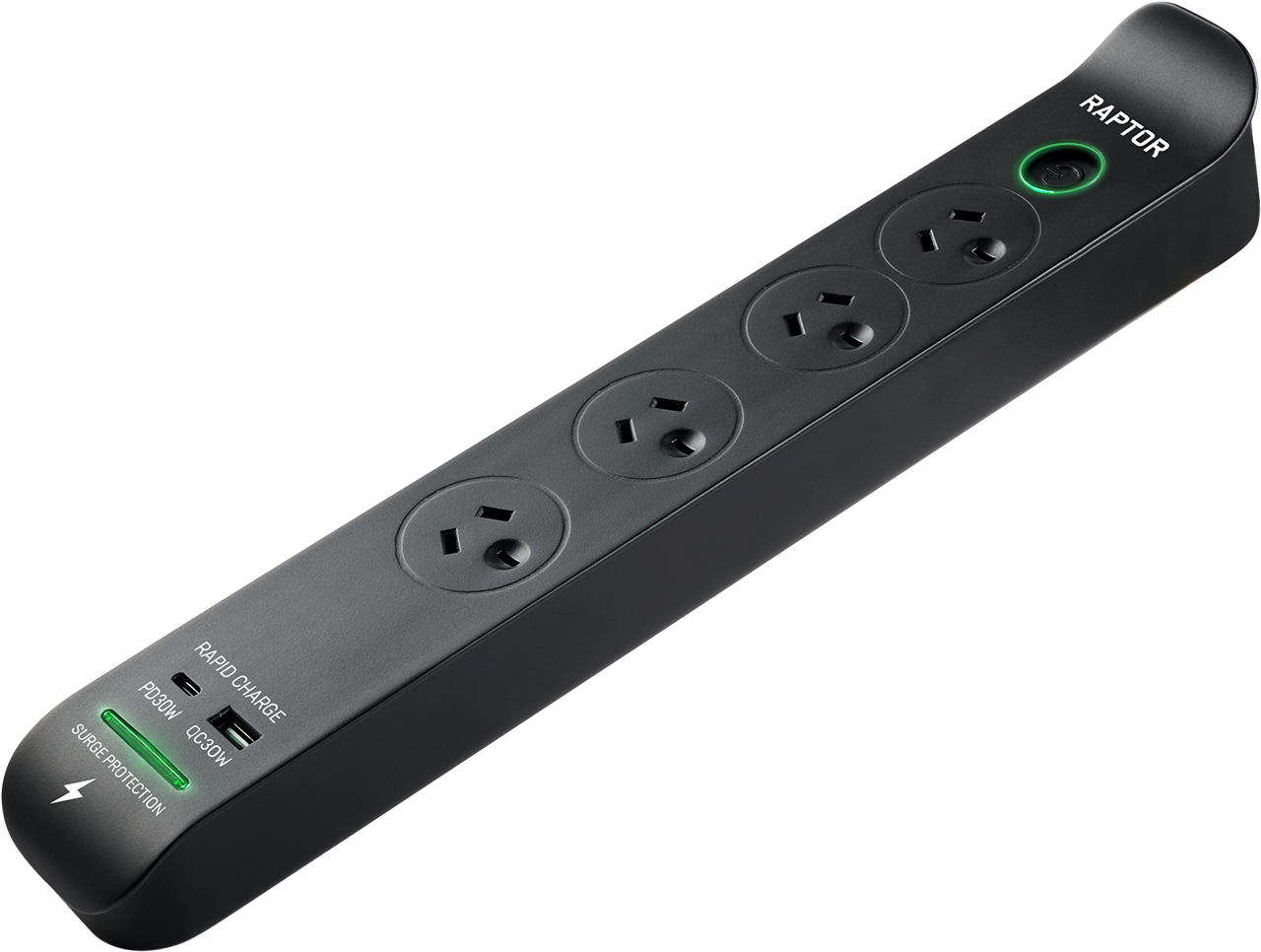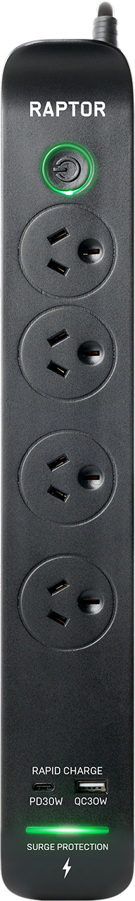 Raptor Surge Protectors have been designed in Australia to meet the high demands of today's electronic devices including: Gaming, TV's, Audio and Computers. The Patented Surge protection, and Fireproof MOV's built into Raptor will protect your equipment in less than 20 Nano Seconds from surges of power entering your home. The High Powered PD 30W USB-C charging port will directly charge your devices including laptops, Tablets, and Gaming accessories etc. The stylish design of Raptor makes it ideal to sit on display powering and protecting your devices, or sat in the background quietly doing its job.