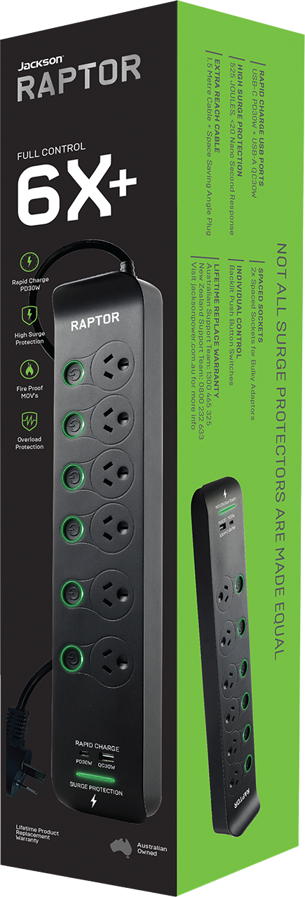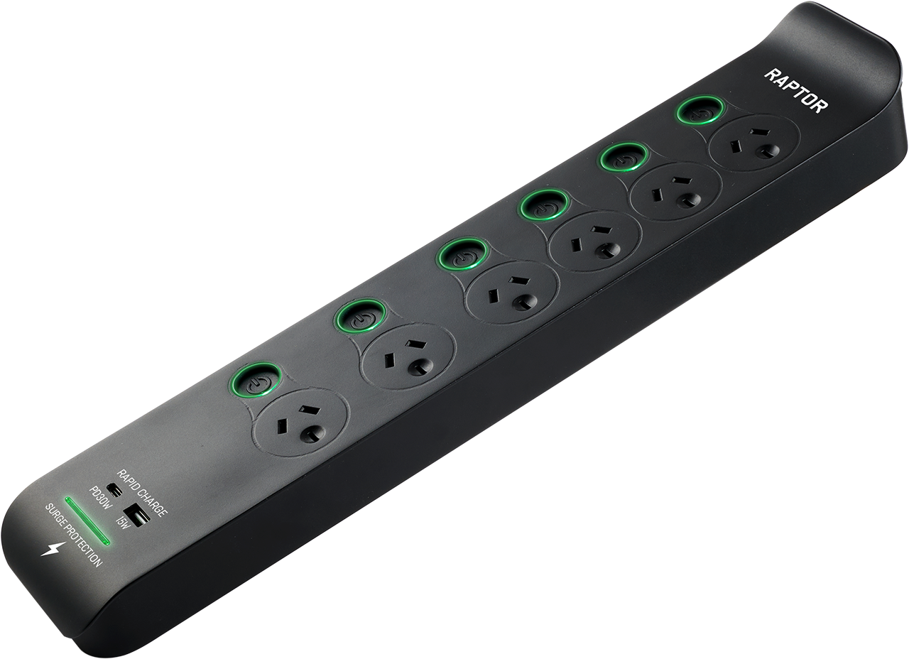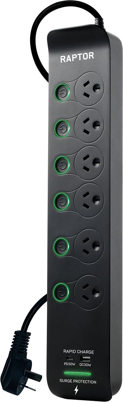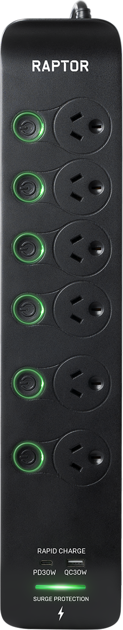 Raptor Surge Protectors have been designed in Australia to meet the high demands of today's electronic devices including: Gaming, TV's, Audio and Computers. The Patented Surge protection, and Fireproof MOV's built into Raptor will protect your equipment in less than 20 Nano Seconds from surges of power entering your home. The High Powered PD 30W USB-C charging port will directly charge your devices including laptops, Tablets, and Gaming accessories etc. The stylish design of Raptor makes it ideal to sit on display powering and protecting your devices, or sat in the background quitley doing its job