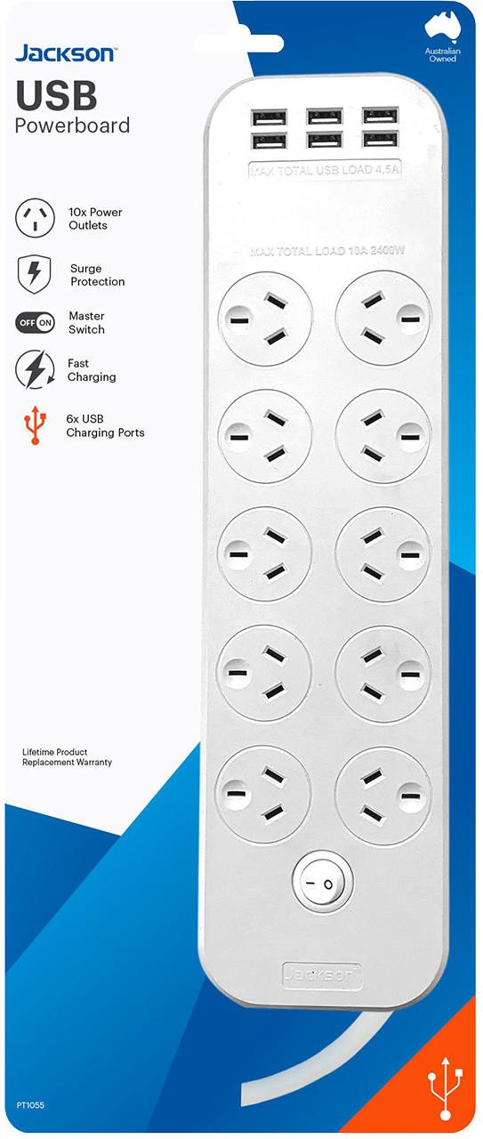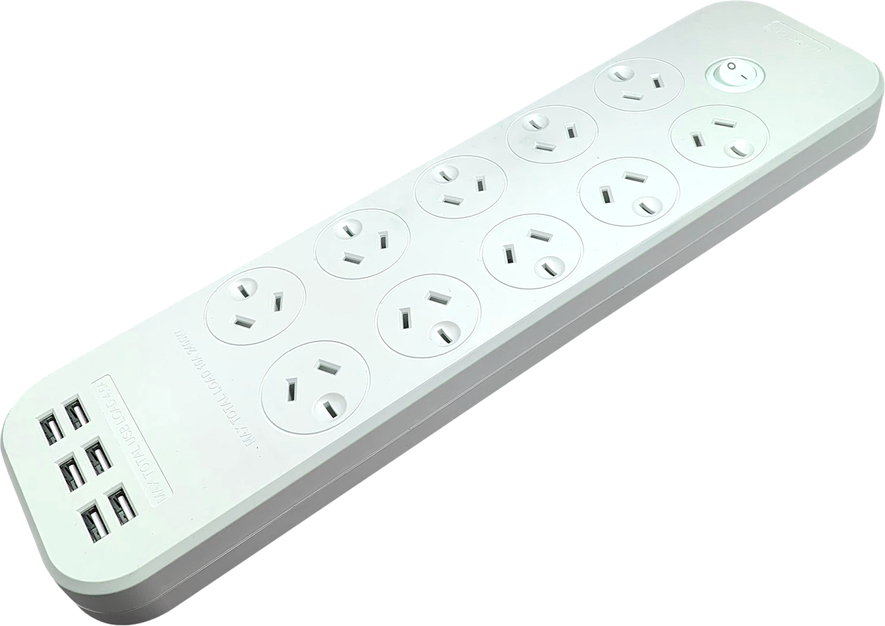 There are 10 Surge Protected outlets, 6 Fast Charge USB ports plus a master switch so you don?t need access to your wall switch to turn off the power.