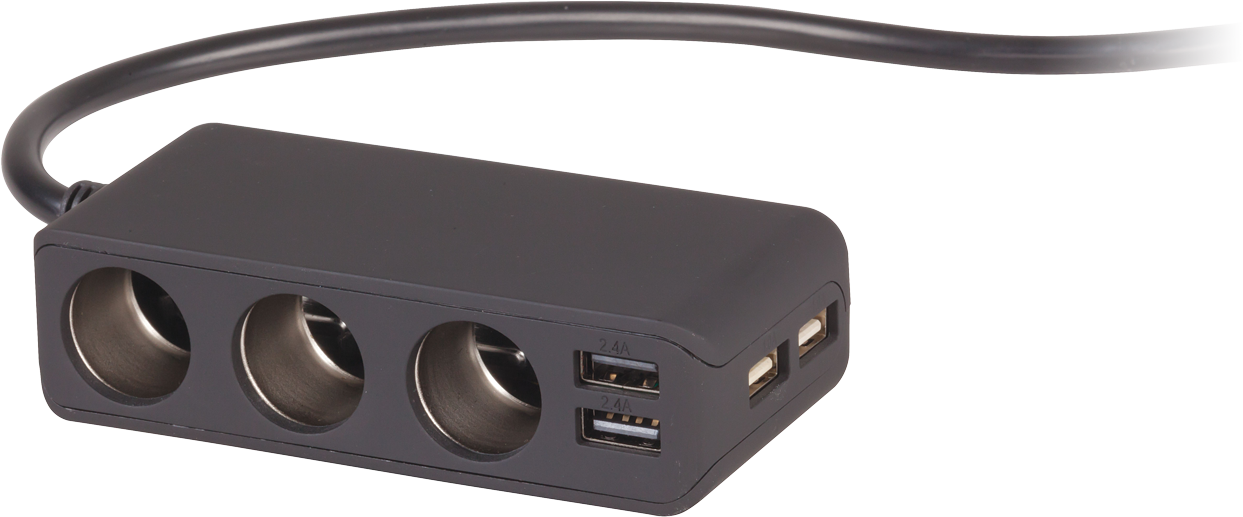 This is the master of in-vehicle power distribution. Take what is probably the only cigarette lighter socket in your dash, and power up to 7 devices! You get three cigarette lighter sockets, two high-current 2.4A USB charging sockets, and two standard 1A USB charging sockets. Of course, a 120W maximum total applies (since that’s the maximum rating of the one in your dash). The three cigarette lighter sockets aren’t voltage regulated, sothey’ll output the same voltage as your vehicle, however the USB charging ports are regulated to 5VDC regardless of the input. Connecting cable is 1m long.