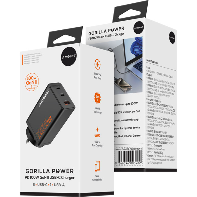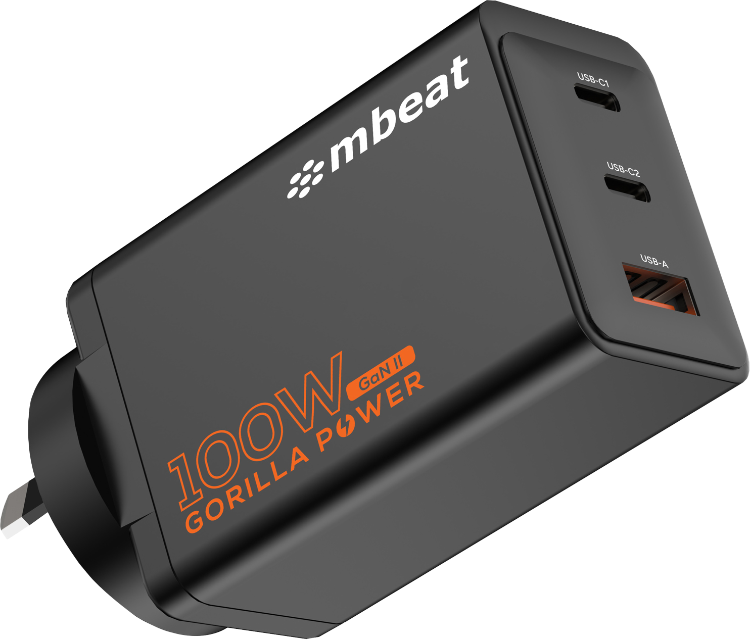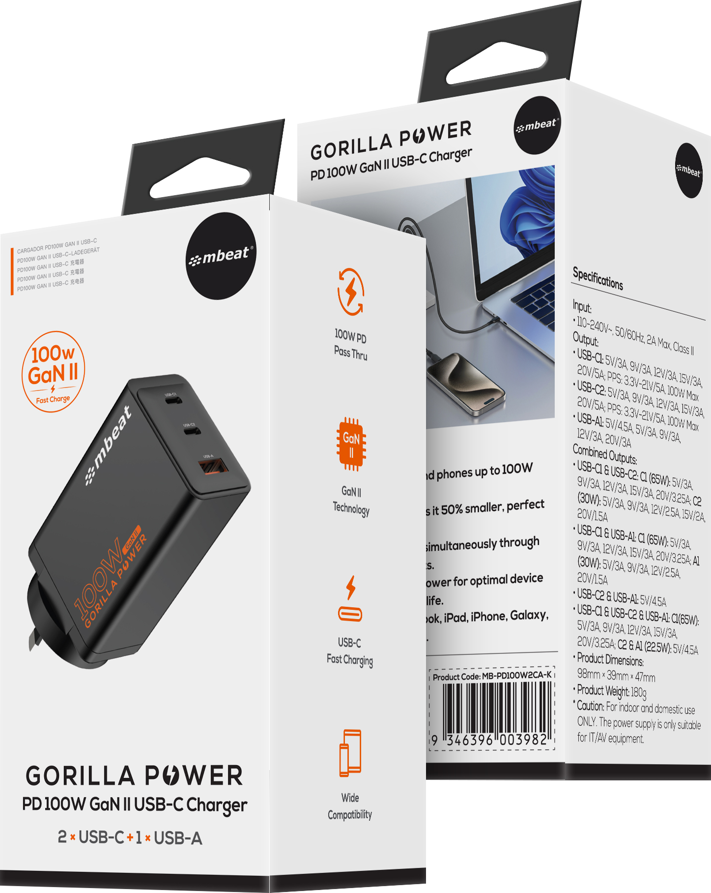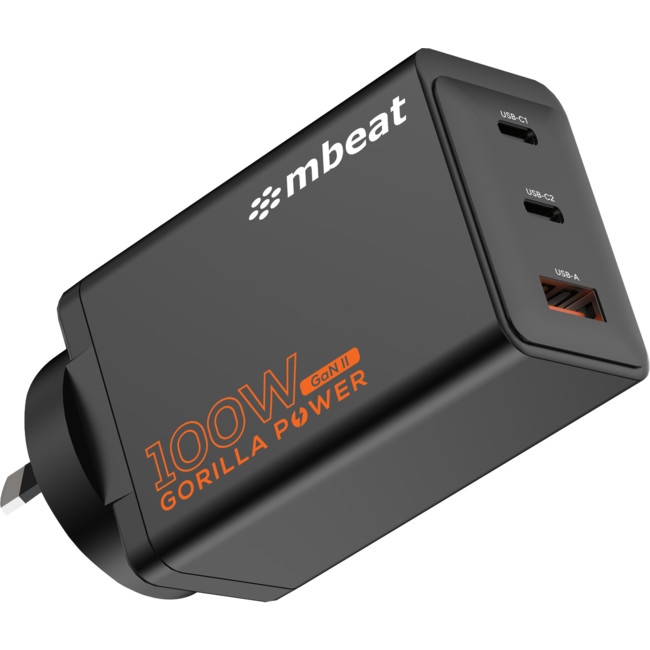 The mbeat Gorilla Power PD 100W GaN II USB-C charger offers 100W high-speed charging for laptops and smartphones, supports multiple devices simultaneously, features compact GaN II technology, intelligent power management, and broad compatibility with various USB-C enabled devices.