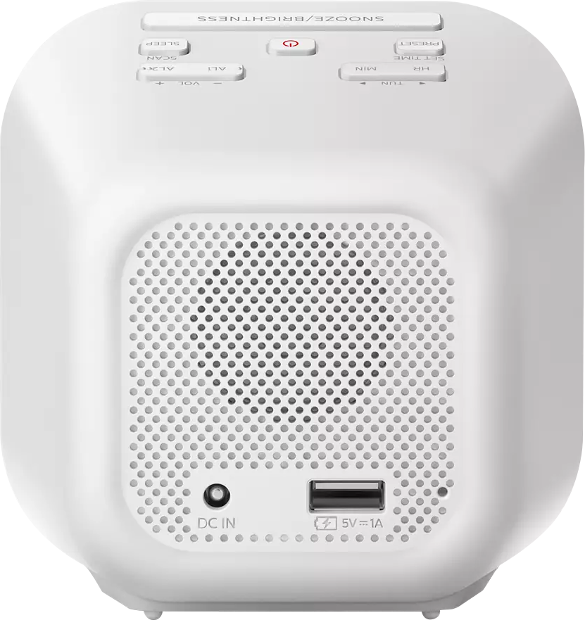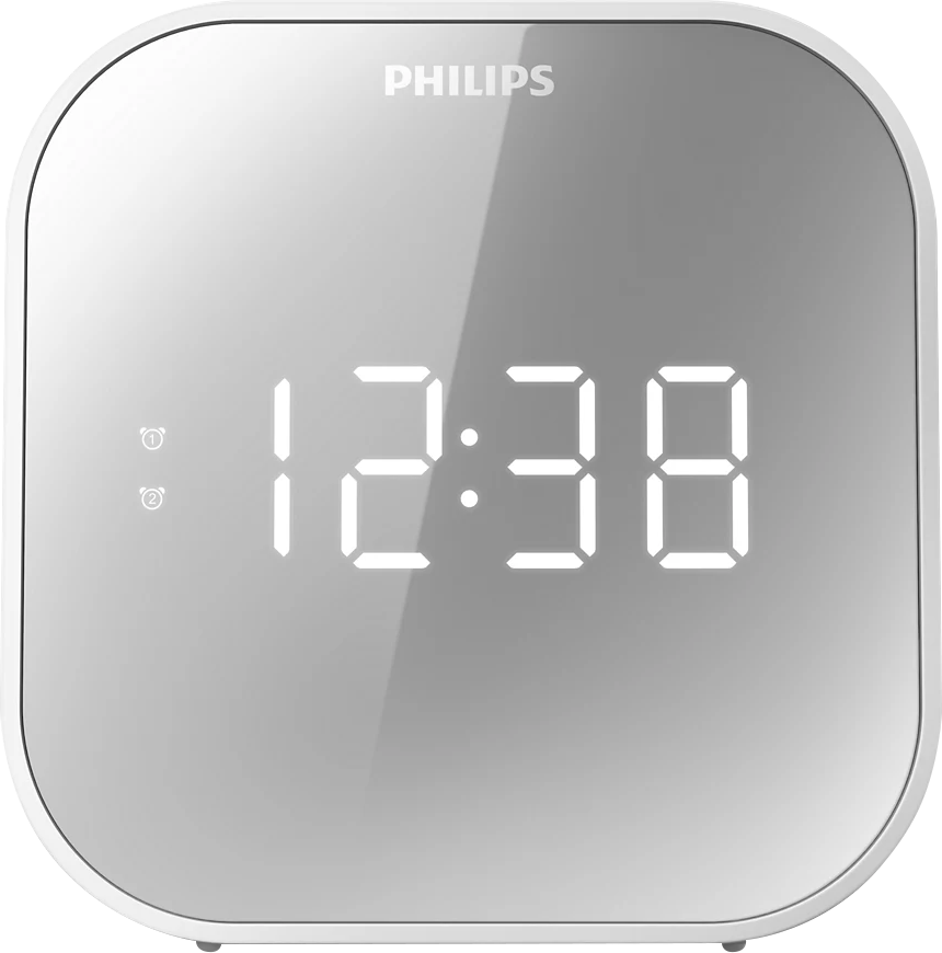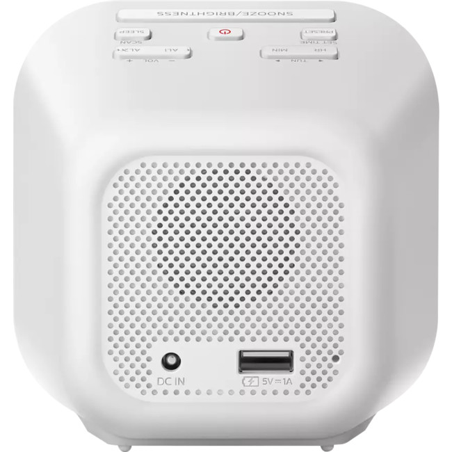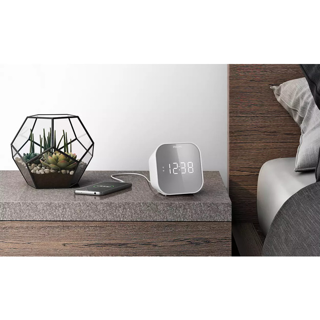 • Tuner: FM radio 20 presets • Output power: 700mW RMS (mono) • 12/24 Hour Mirror Large display • Backup battery: AAA x 2 (not included) • Dual Alarm ? Buzzer or FM radio • Sleep timer: 15/30/60/90/120 mins • Snooze: Yes, 9 mins • Display brightness: High/Mid/Low • USB Charging: 5V, 1A