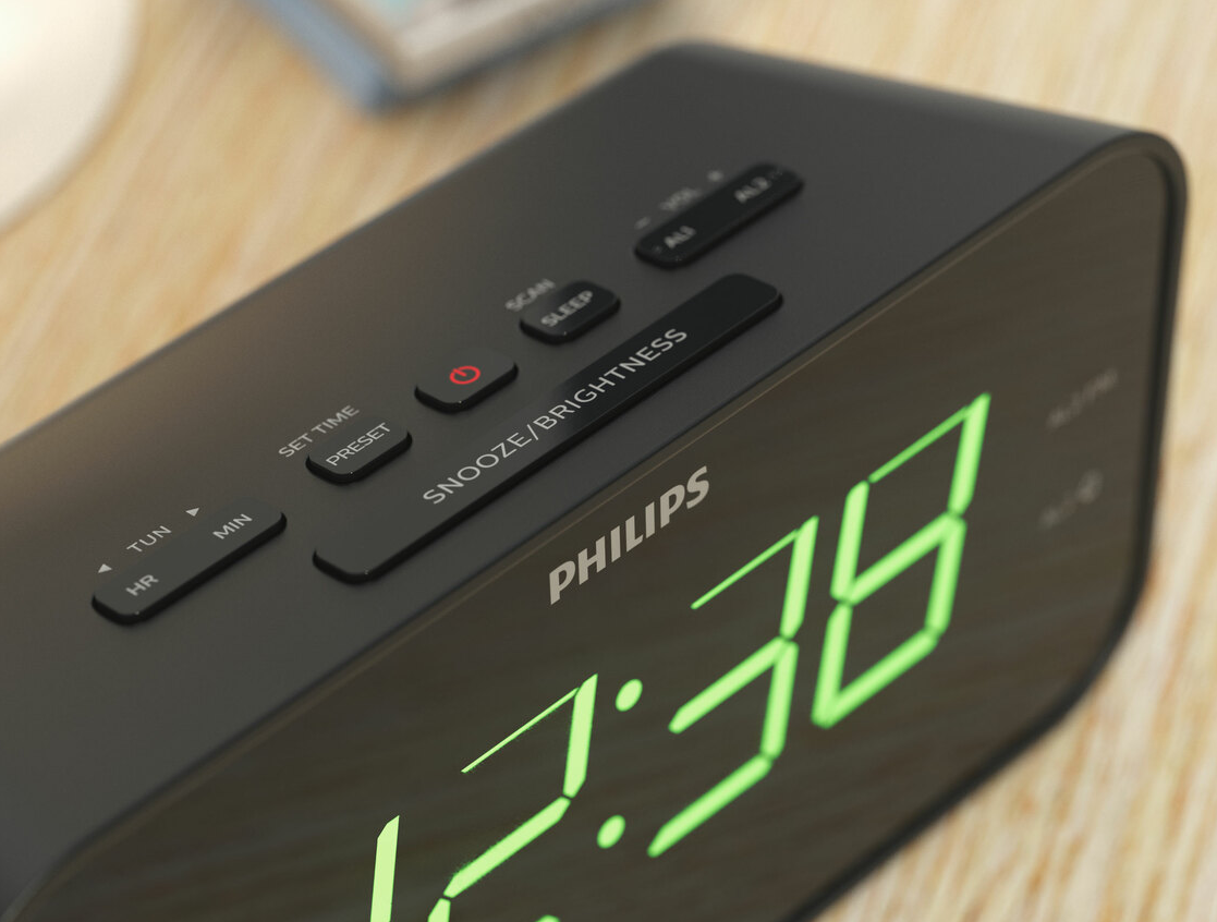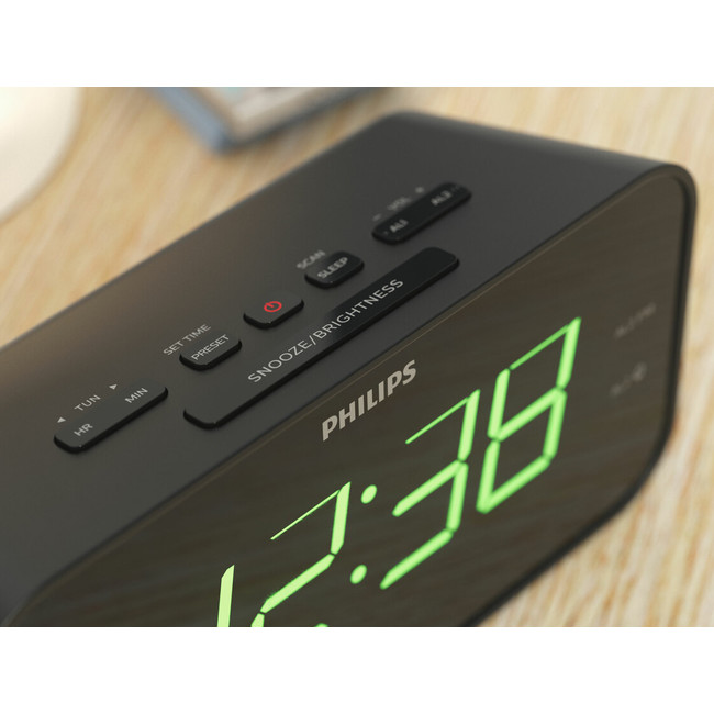 Wake to a favorite radio station or an alarm tone with this slimline FM clock radio. A gently rising volume eases you into the day, and the Sleep Timer lets you drift off to the radio at night. A big display makes it easy to see the time.