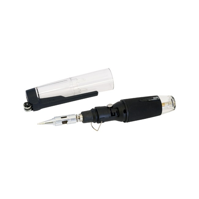 The advanced IRODA Solderpro 50 Iron offers go-anywhere soldering convenience, with an equivalent heat capacity of up to 70 Watts. It features an adjustable heat control, cap mounted flint igniter, long life catalyst tip and a 7ml gas reservoir for up to 30 minutes use. Adjustable from 210-400°C.