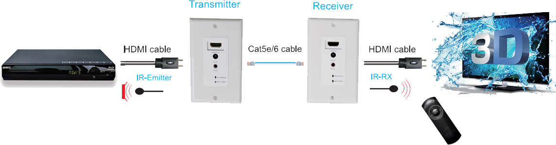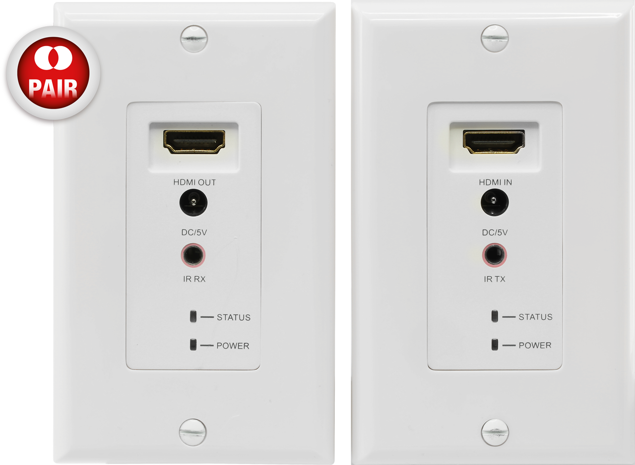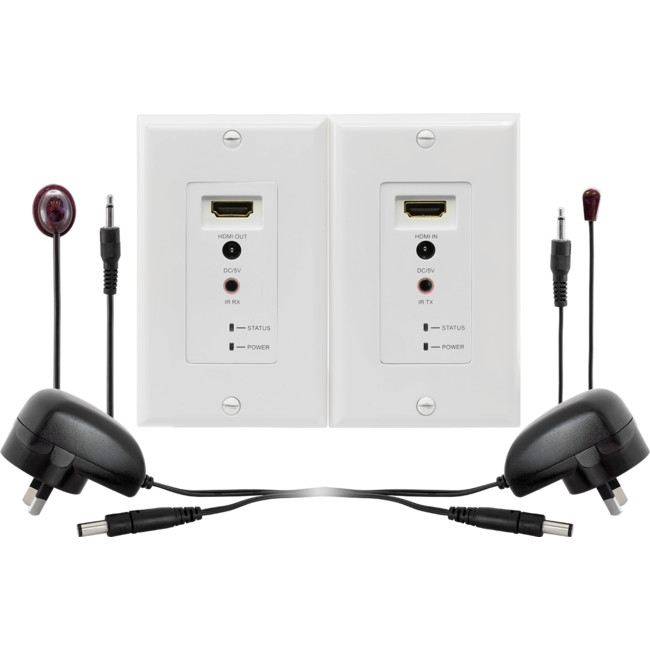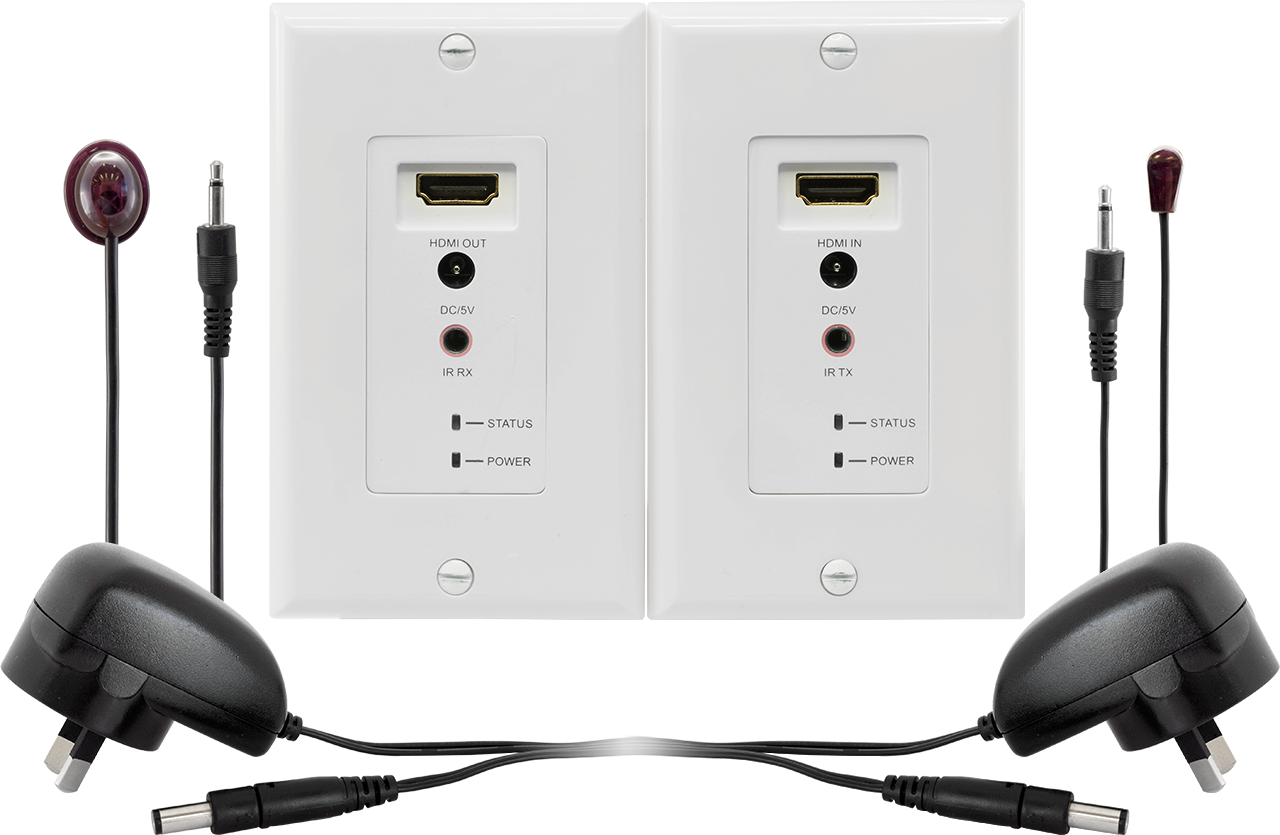 A neat and simple wall plate high definition HDMI extender kit. This kit extends your high definition AV source from your Blu-ray DVD Players, Playstation and Xbox etc. up to a maximum 60m via CAT5E/6 cables through the wallcavities. Supports full 1080P high definition of up to 60m. Integrates an infra-red control extender for full controllability from the receiving end. RJ45 connections on the rear of both units makes it for easy connection.