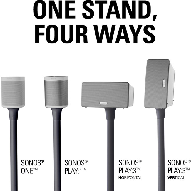 This stylish speaker stand fits the Sonos™ ONE, Sonos One SL, PLAY:1 and PLAY:3 and is designed specificallyto complement their modern brand aesthetic.