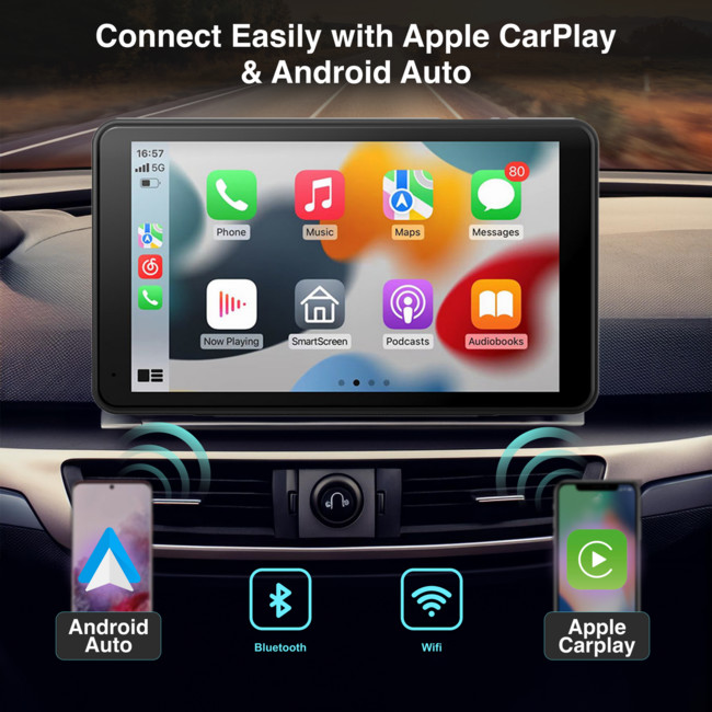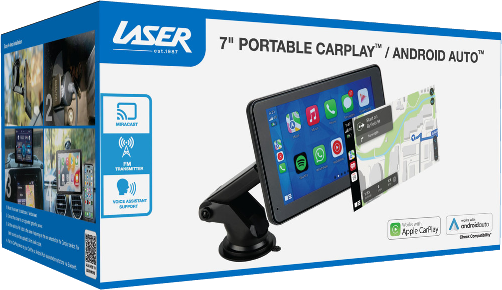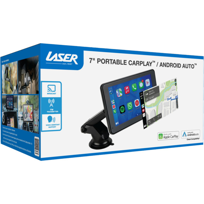 The Laser 7" Portable Apple CarPlay/Android Auto Touchscreen brings Apple CarPlay and Android Auto technologies to any vehicle, offering convenience, safety, and functionality. It integrates with your car, keeping you connected and entertained while on the road.
