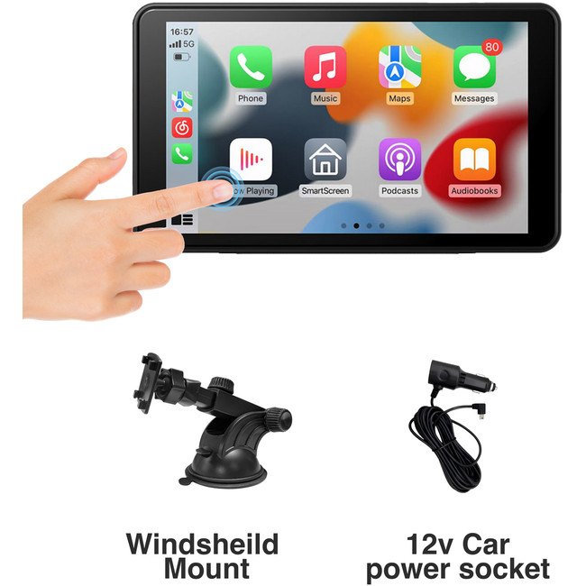 In The Box | 7" Wireless CarPlay screen, Windscreen mount, 12V Car Power Socket to USB-C Cable, Quick Start Guide |