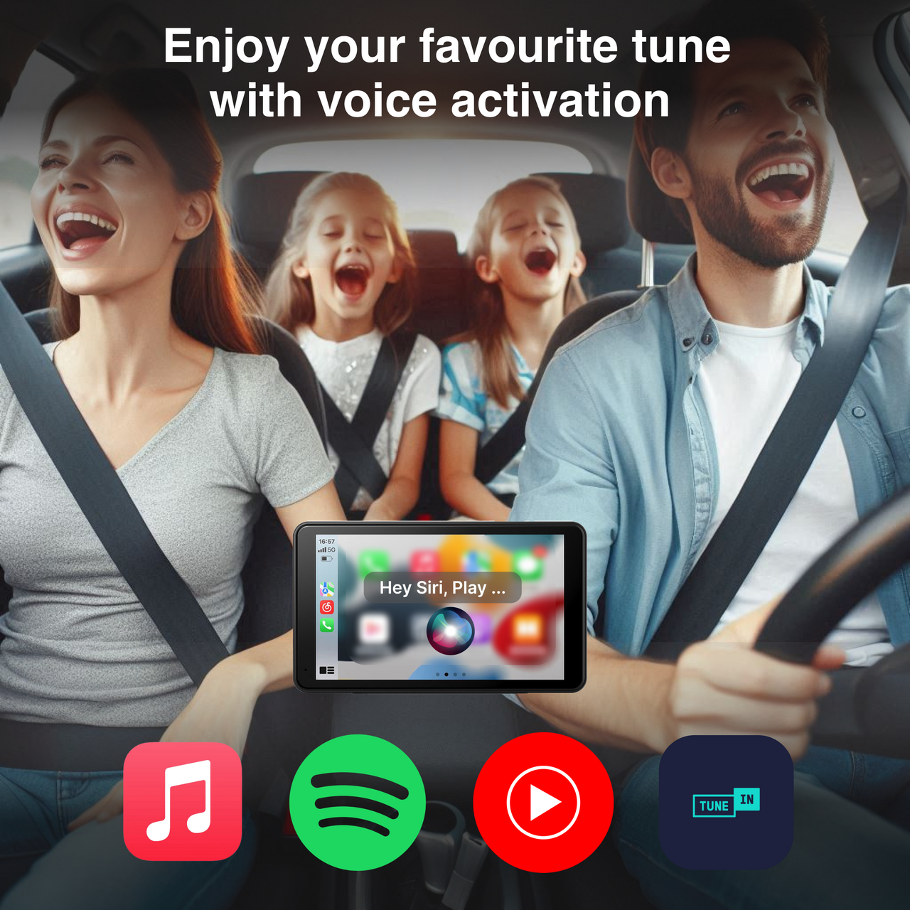 Stream, cast and play your favourite songs, playlists, or podcasts. Whether you use Spotify, Apple Music, TuneIn, Amazon Music, or any other app on your phone, it's available on the CarPlay/Android Auto screen. For example, say, "Hey Siri, play some Taylor Swift."