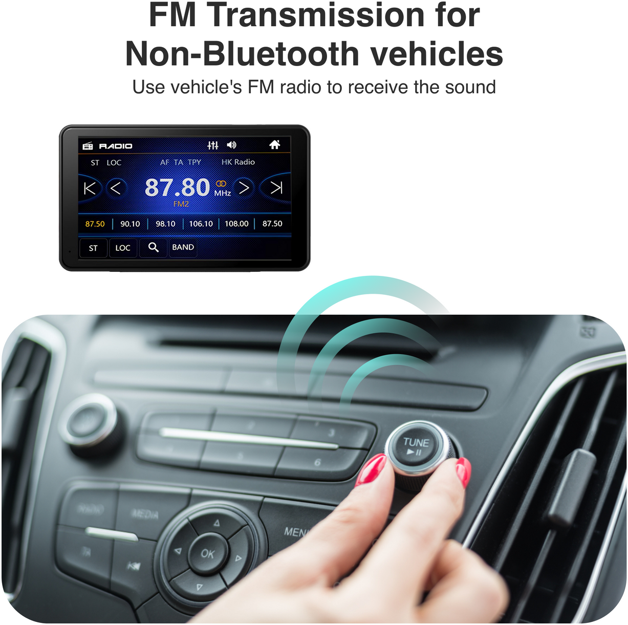 With a selection of preset stations on the device, simply tune your FM radio to one of these presets to enjoy audio through your car's sound system. Alternatively, if you prefer not to use the car stereo, the device includes a built-in speaker for your convenience.