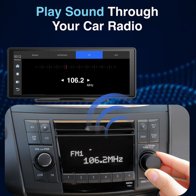 What's in the Box | 10 inch CarPlay Screen, USB-C to 12/24V Car Power Cable, Dashboard Mount, Windscreen Mount, 3.5mm AUX Cable, User Manual |