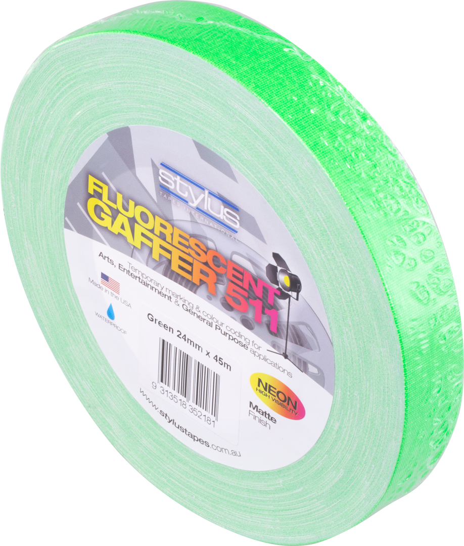 Neon coated cloth duct tape, 24mm wide, coloured, with a natural rubber-resin blend adhesive system.