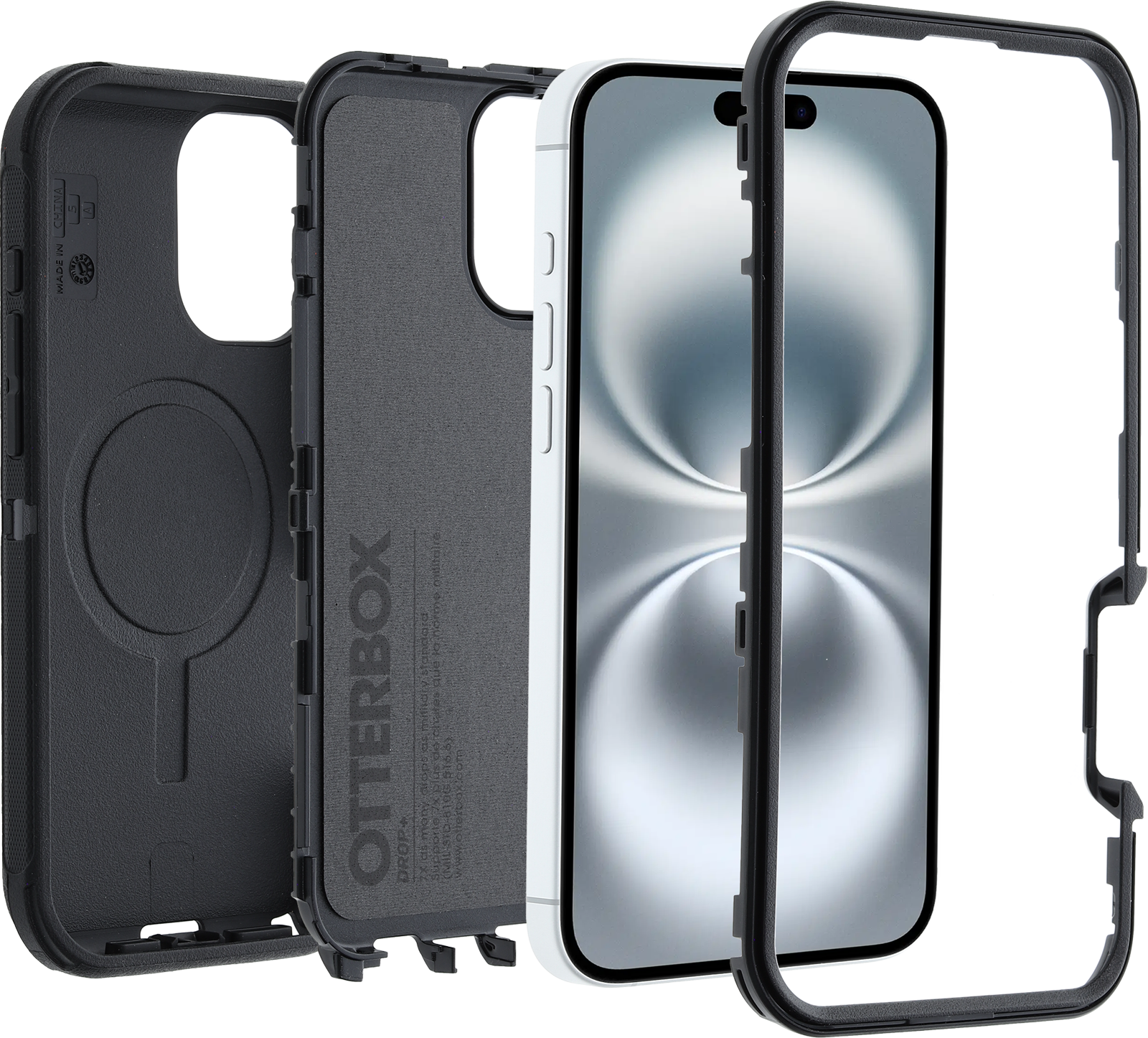 For peak protection, trust Defender Series for MagSafe, our toughest case yet. It features a tri-layer design with a silicone outer cover, rigid inner shell and memory foam backing that work together to deflect whatever damage might come your way and deliver 7X military standard drop defense. Plus, it's equipped with corners that absorb shock, all-over texturing for greater grip, integrated MagSafe magnets and built-in anchors for connecting phone straps. When you need real defenses, you need Defender Series for MagSafe. *Holster not included Features : Precision designed opening for easy interaction with Camera Control without compromising on protection Tri-layer defense with a silicone cover to resist bumps, rigid inner shell to hold your phone in place and a memory-foam backing for stability All-over texture delivers greater grip that helps prevents drops before they happen Port covers block dust and dirt Built-in magnets snap firmly to MagSafe chargers and accessories Redesigned corners are reinforced to deliver added cushioning and easier pocketing Built-in anchors let you connect phone straps to prevent drops Screen lip keeps display hovering safely off surfaces Holster not included Works with OtterBox screen protectors Hassle-free customer experience Specifications : Compatibility : iPhone 16 Plus Drop Rate : Drop |7X as many drops as military standard (MIL-STD-810G 516.6) Dimensions : 6.79 in x 3.56 in x 0.58 in / 172.59 mm x 90.47 mm x 14.84 mm Weight : 0.12 lbs | 55.55 g Materials : Polycarbonate Layer, Thermoplastic Elastomer, MagSafeRecycled Content : Defender Series contains a minimum of 45% recycled content, consisting of 100% recycled plasticsPlease Note: Single case supplied only. Phone in images is for illustrative purposes only.